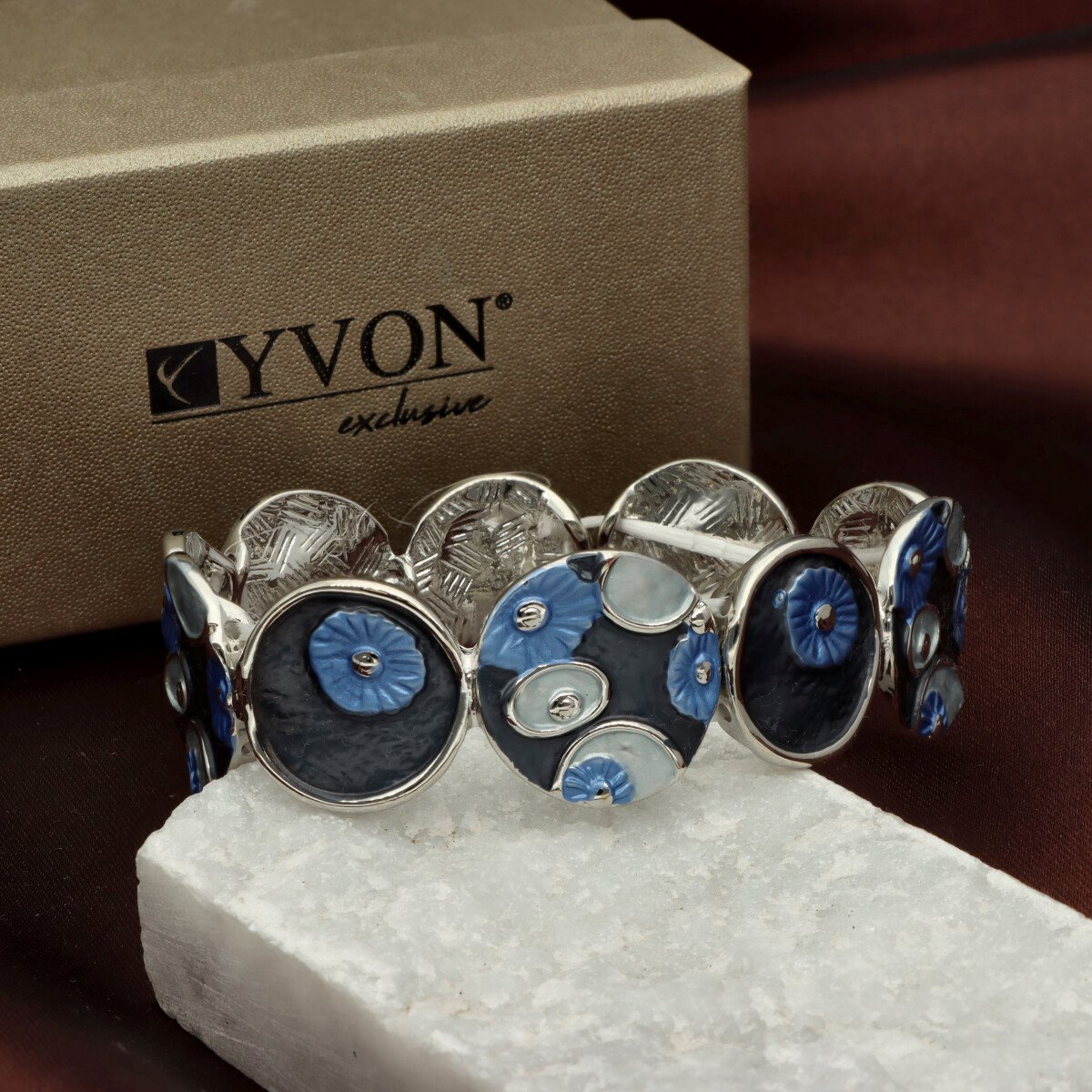 Bransoleta z kolekcji YVON biżuteria artystyczna, wykonana z metalu hipoalergicznego, zdobiona emaliowanymi elementami. Konstrukcja oparta na elastycznych gumeczkach dopasowuje się do każdego nadgarstka, zapewniając komfort noszenia. Wykończona z dbałością o detale, zachwyca artystycznym wzornictwem. Zapakowana w eleganckie pudełko prezentowe YVON – doskonały wybór zarówno do codziennych, jak i wieczorowych stylizacji.