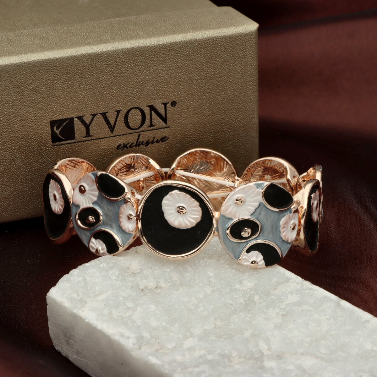Bransoleta z kolekcji YVON biżuteria artystyczna, wykonana z metalu hipoalergicznego, zdobiona emaliowanymi elementami. Konstrukcja oparta na elastycznych gumeczkach dopasowuje się do każdego nadgarstka, zapewniając komfort noszenia. Wykończona z dbałością o detale, zachwyca artystycznym wzornictwem. Zapakowana w eleganckie pudełko prezentowe YVON – doskonały wybór zarówno do codziennych, jak i wieczorowych stylizacji.