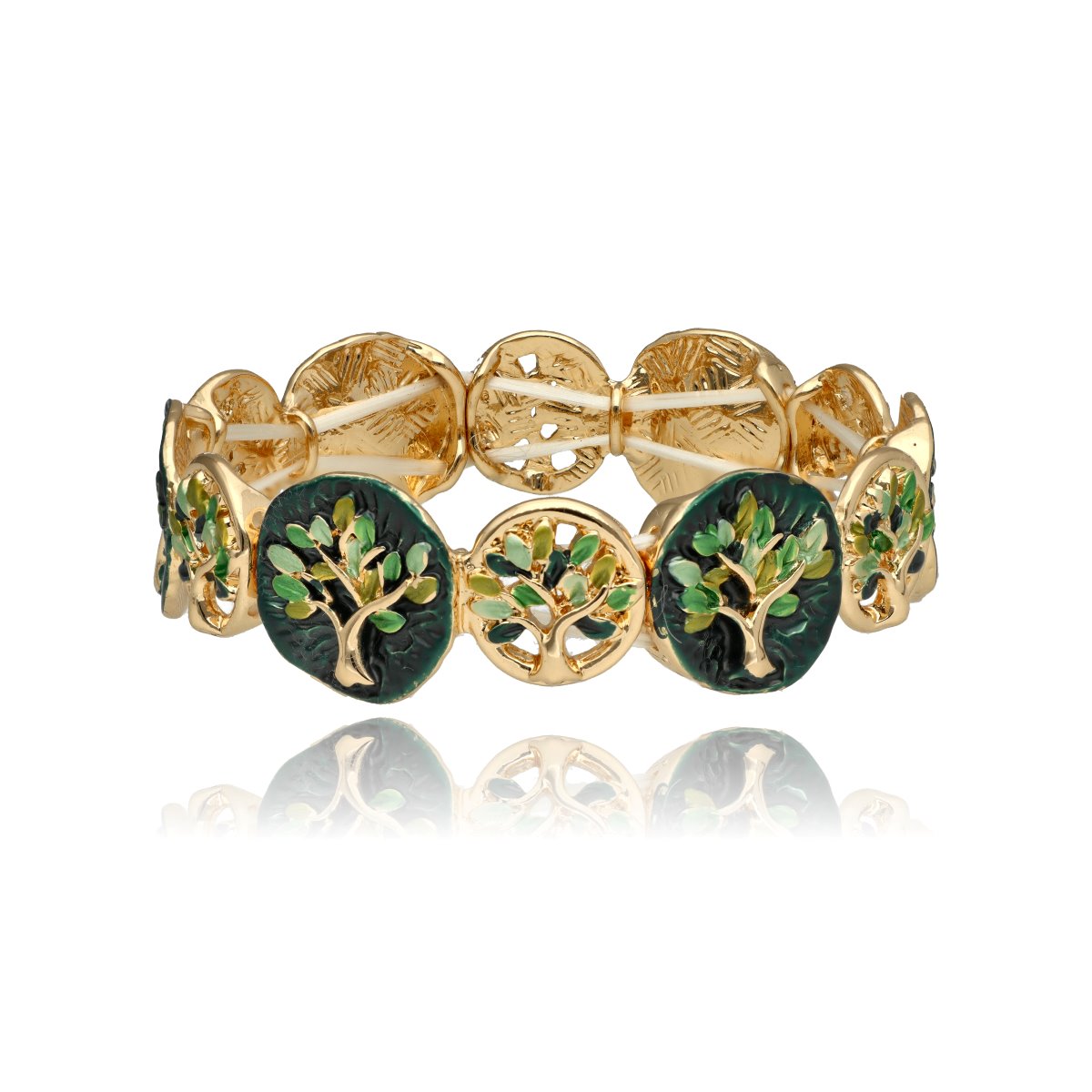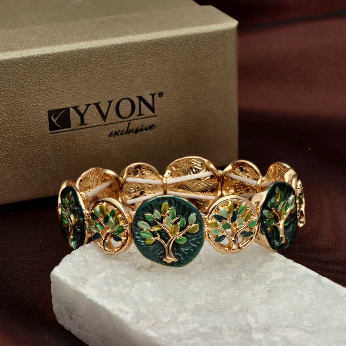 Bransoleta z kolekcji YVON BIŻUTERIA ARTYSTYCZNA, wykonana z metalu hipoalergicznego i zdobiona emaliowanymi elementami. Konstrukcja oparta na elastycznych gumeczkach dopasowuje się do każdego nadgarstka, zapewniając komfort noszenia. Wykończona z dbałością o detale, zachwyca artystycznym wzornictwem. Zapakowana w eleganckie pudełko prezentowe YVON – doskonały wybór zarówno do codziennych, jak i wieczorowych stylizacji.