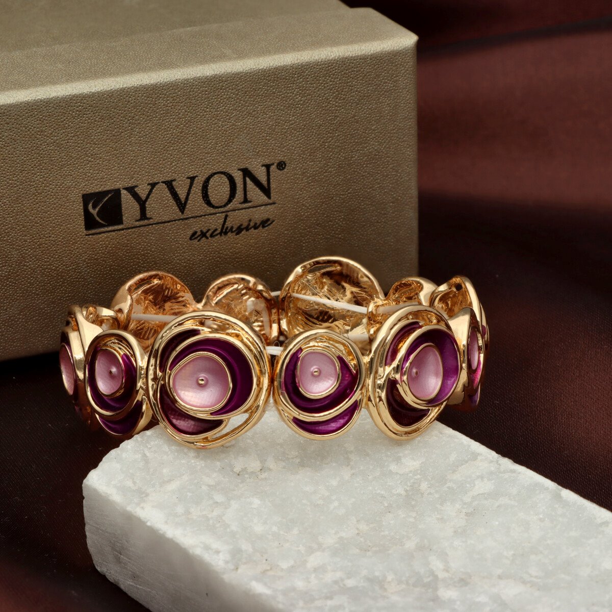 Bransoleta z kolekcji YVON BIŻUTERIA ARTYSTYCZNA, wykonana z metalu hipoalergicznego i zdobiona emaliowanymi elementami. Konstrukcja oparta na elastycznych gumeczkach dopasowuje się do każdego nadgarstka, zapewniając komfort noszenia. Wykończona z dbałością o detale, zachwyca artystycznym wzornictwem. Zapakowana w eleganckie pudełko prezentowe YVON – doskonały wybór zarówno do codziennych, jak i wieczorowych stylizacji.