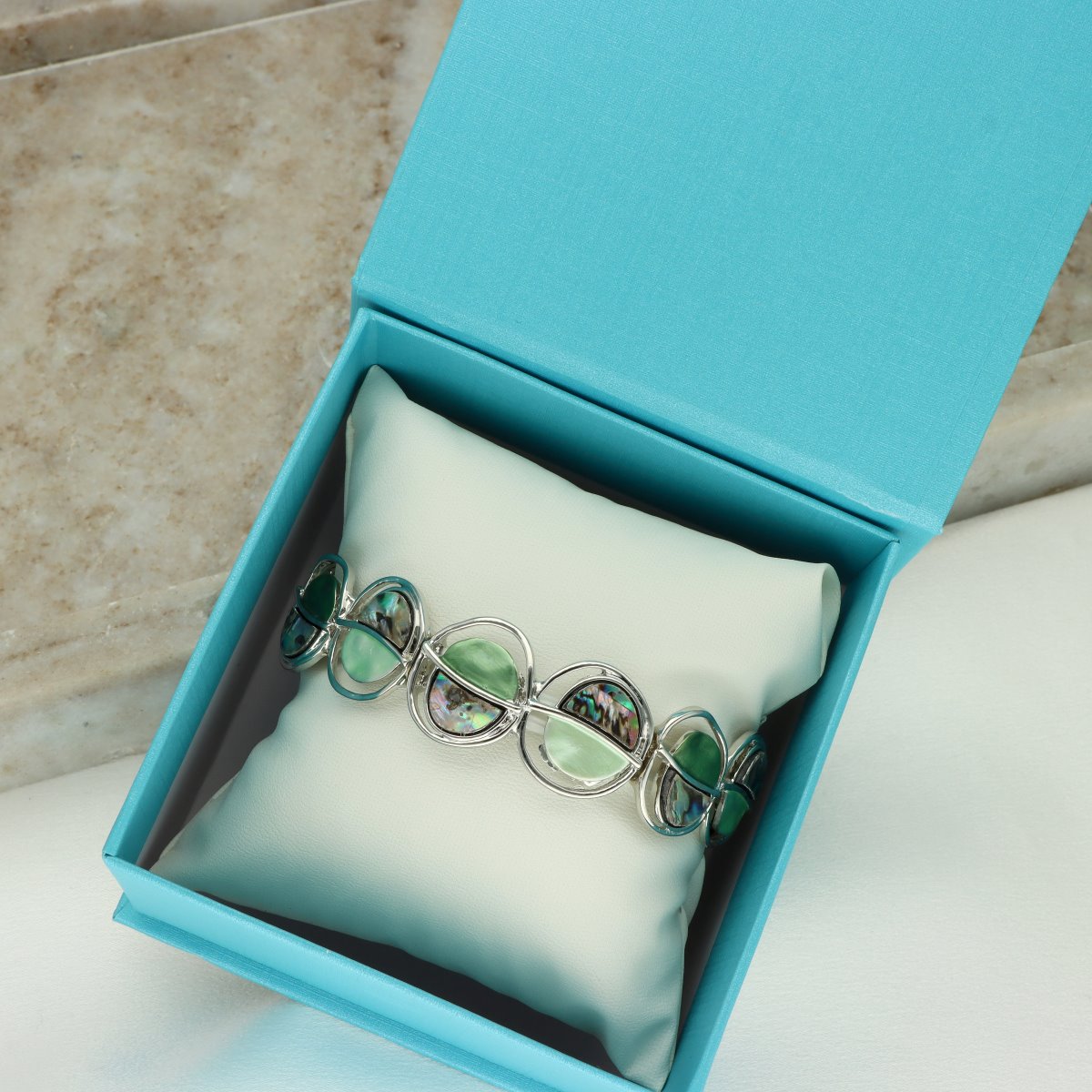 Bransoletka wykonana w konwencji biżuterii artystycznej. Wykonana z antyalergicznego metalu, muszli naturalnej Abalone, ręcznie emaliowana. Rozmiar uniwersalny. W eleganckim pudełku. Szukaj do kompletu naszyjnika i kolczyków o tym samym indeksie numerycznym.