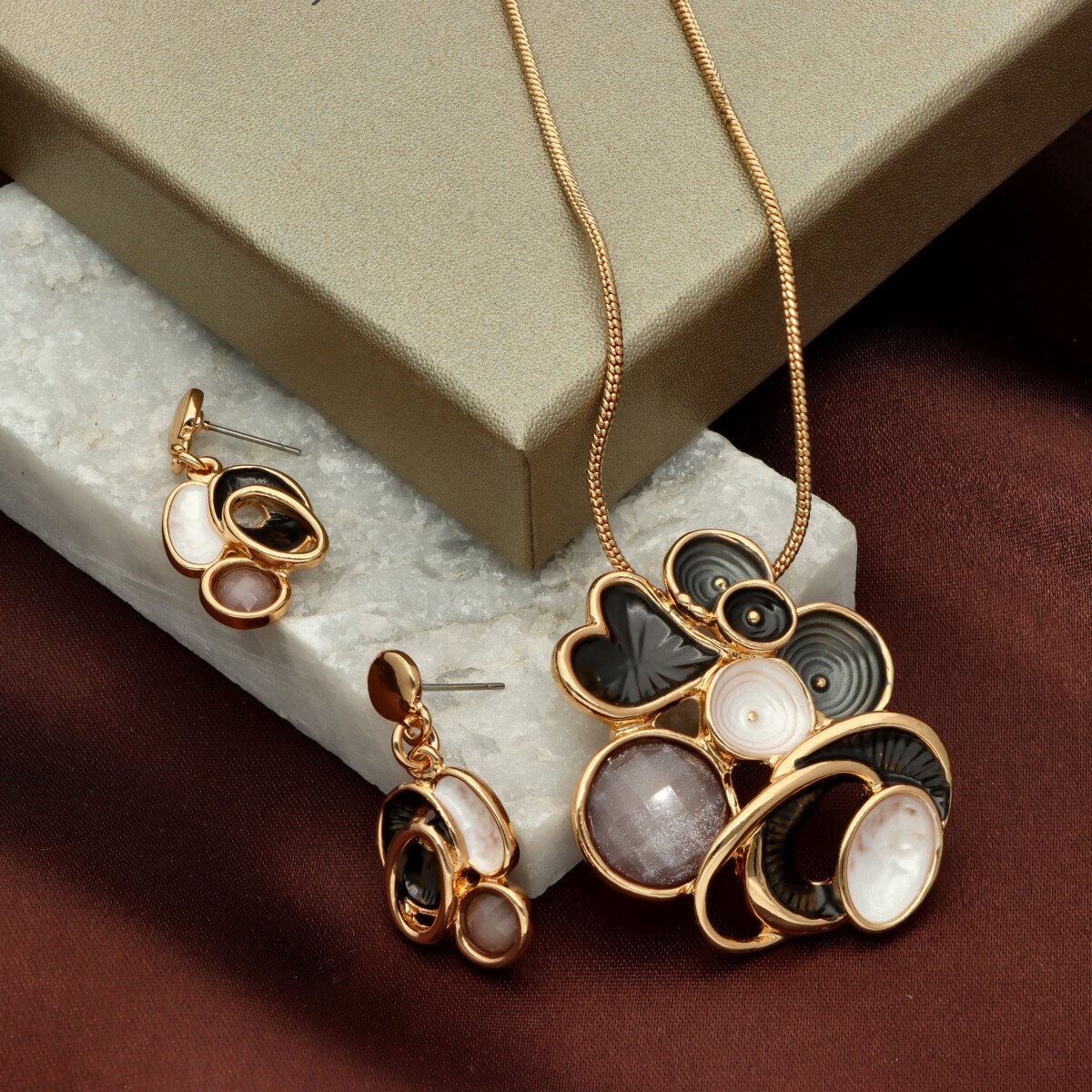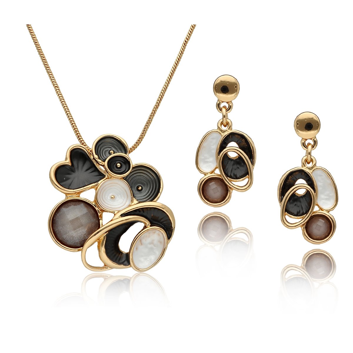 Komplet z kolekcji YVON BIŻUTERIA ARTYSTYCZNA, wykonany z metalu hipoalergicznego. Zdobiony emaliowanymi elementami, które tworzą elegancką, harmonijną kompozycję. Naszyjnik o długości 42 cm z możliwością regulacji o dodatkowe 8 cm, idealnie układa się na dekolcie. Kolczyki na wygodnym zapięciu typu sztyft. Całość zapakowana w eleganckie pudełko prezentowe YVON. To wyjątkowy komplet, który podkreśla kobiecą klasę i artystyczne wyczucie stylu.