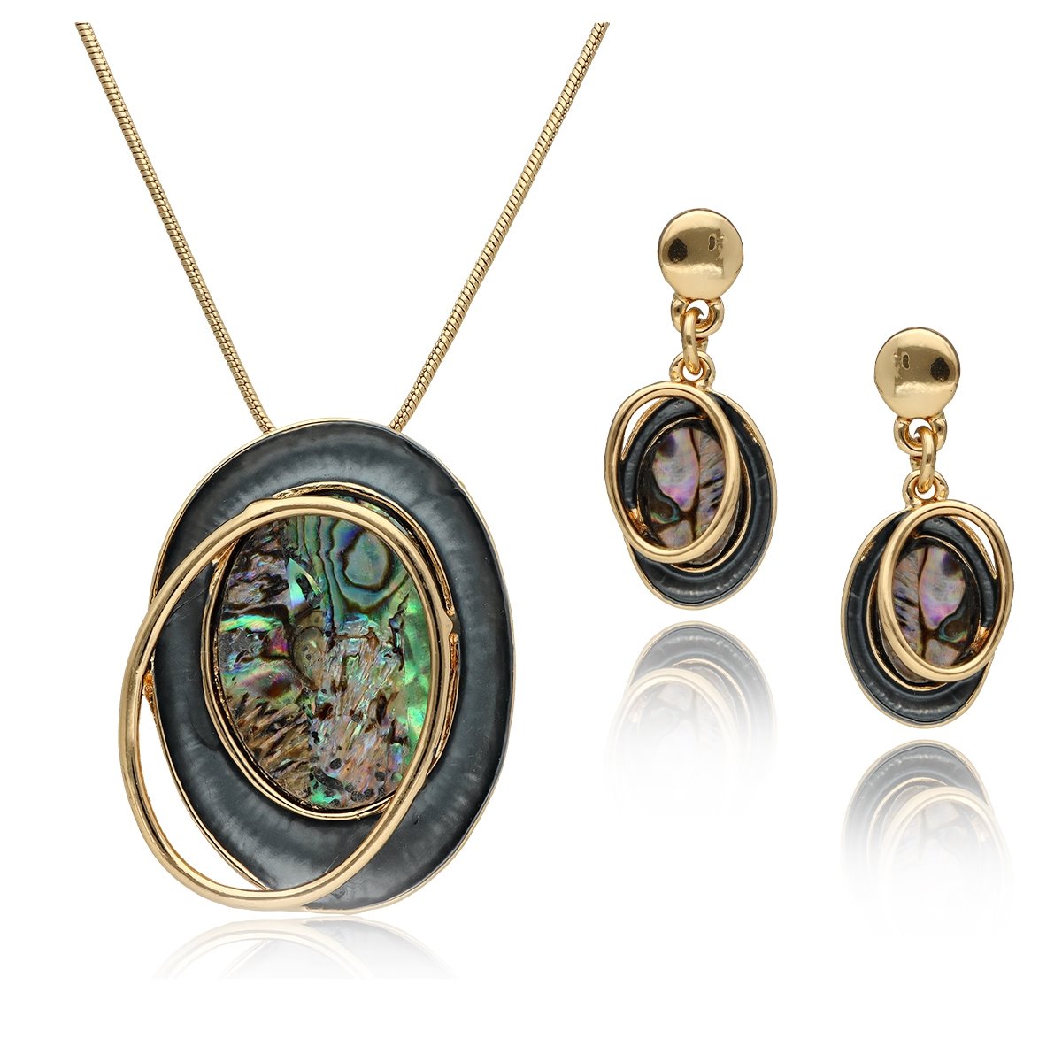 Komplet z kolekcji YVON BIŻUTERIA ARTYSTYCZNA, wykonany z metalu hipoalergicznego. Zdobiony emaliowanymi elementami i muszlą naturalną ABALONE, które tworzą elegancką, harmonijną kompozycję. Naszyjnik o długości 42 cm z możliwością regulacji o dodatkowe 8 cm, idealnie układa się na dekolcie. Kolczyki na wygodnym zapięciu typu sztyft. Całość zapakowana w eleganckie pudełko prezentowe YVON. To wyjątkowy komplet, który podkreśla kobiecą klasę i artystyczne wyczucie stylu.