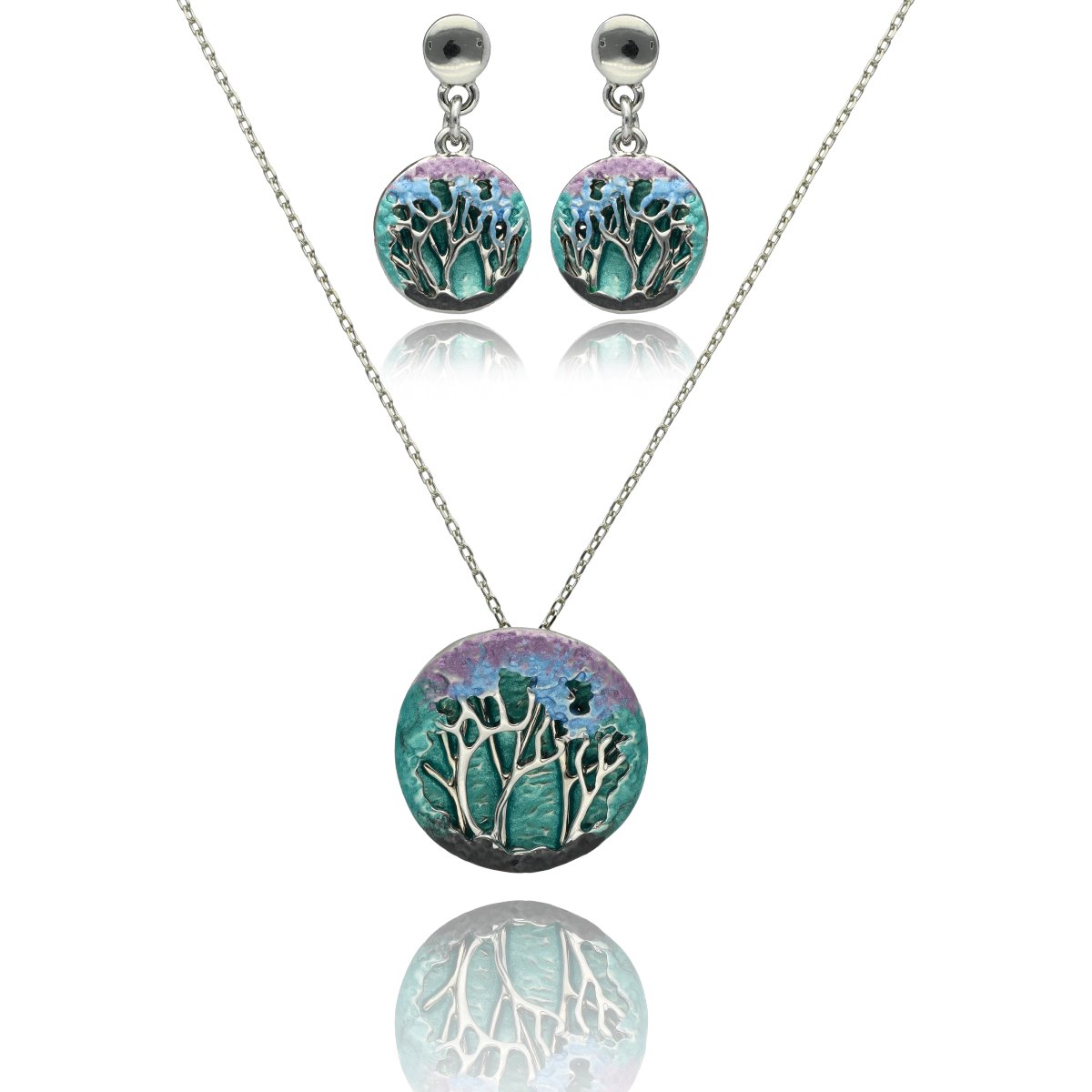 Uroczy zestaw (naszyjnik krótki i kolczyki) biżuterii artystycznej, ręcznie emaliowanej. Całość wykonana z antyalergicznego metalu. W eleganckim pudełku. Szukaj do kompletu bransoletki i broszki na magnes o tym samym indeksie numerycznym.