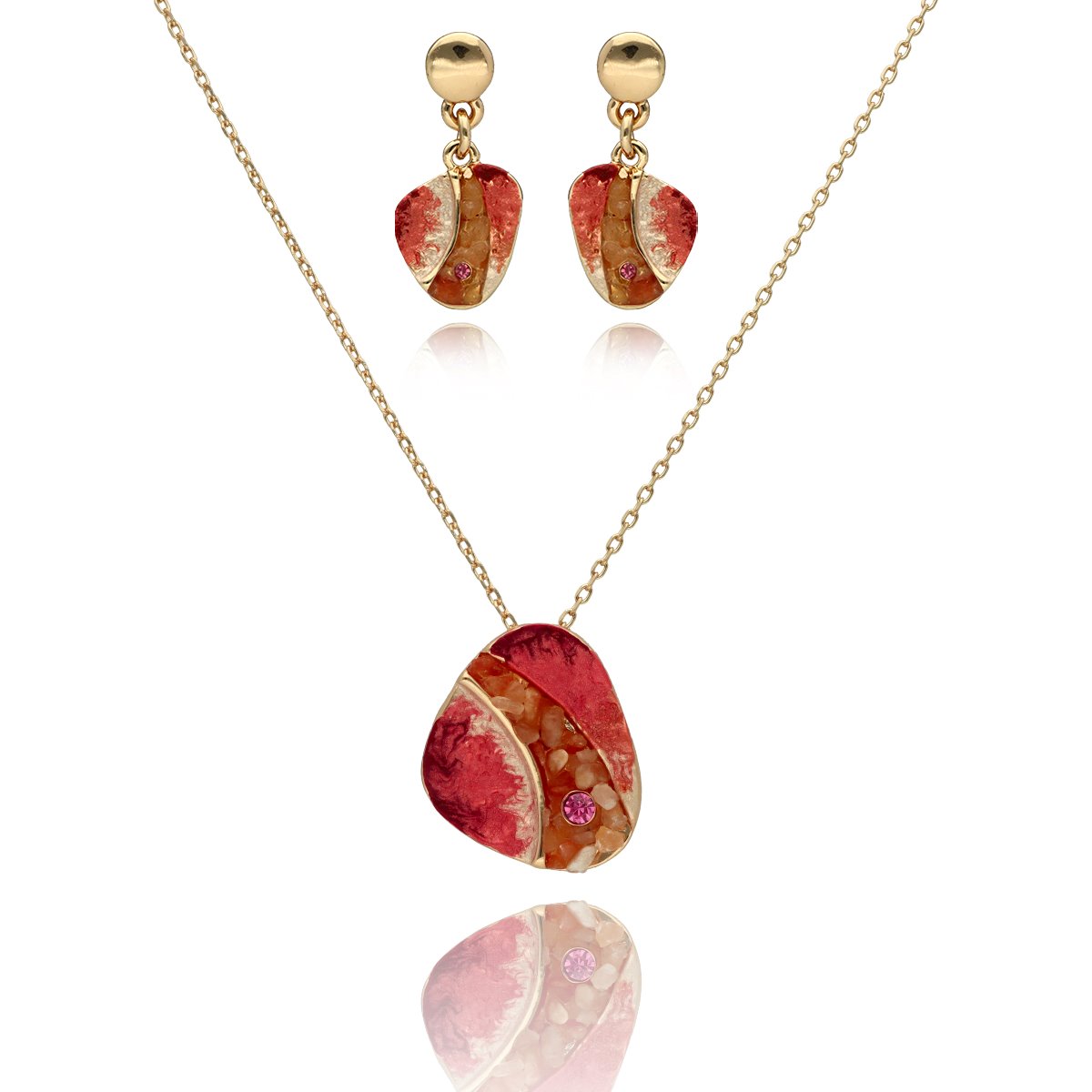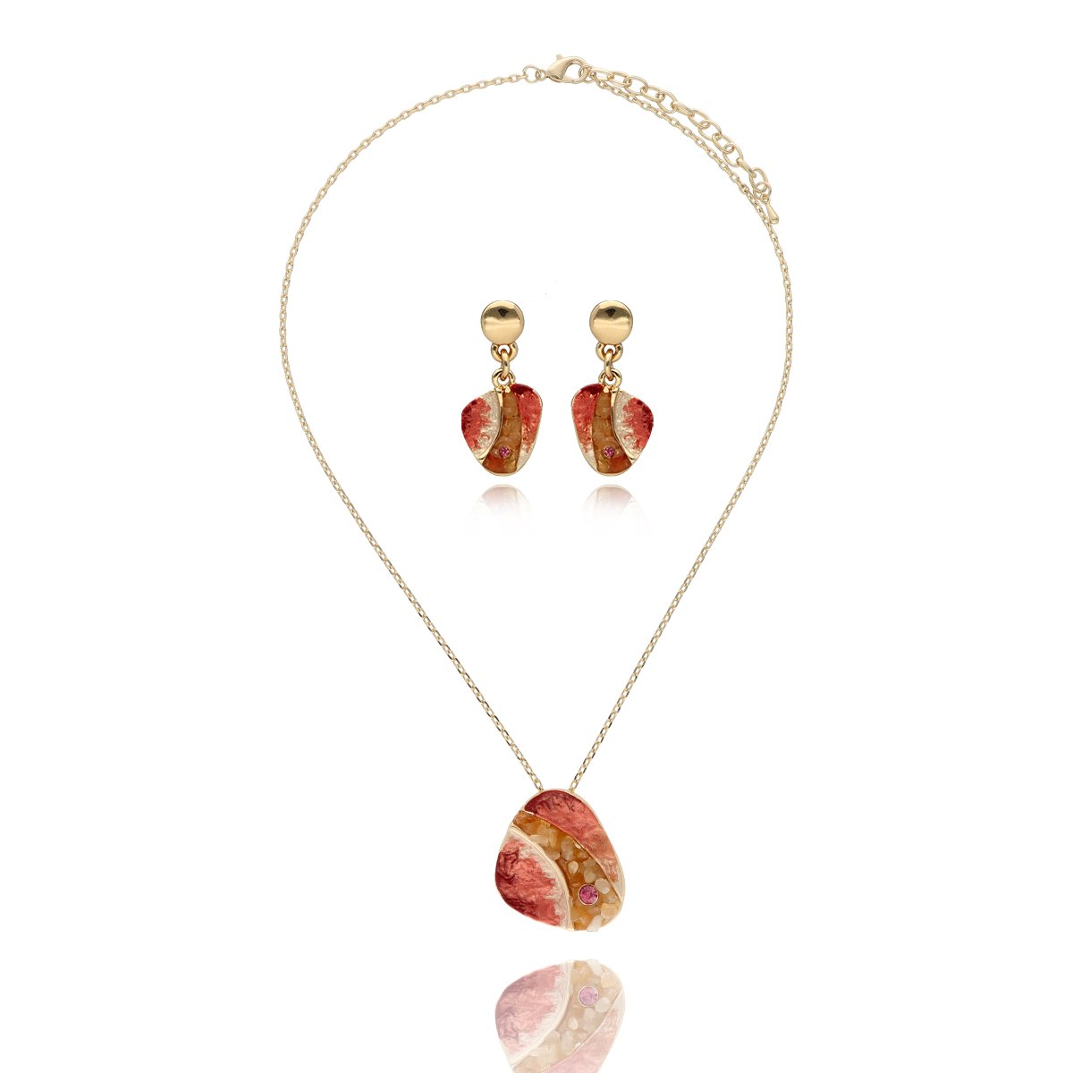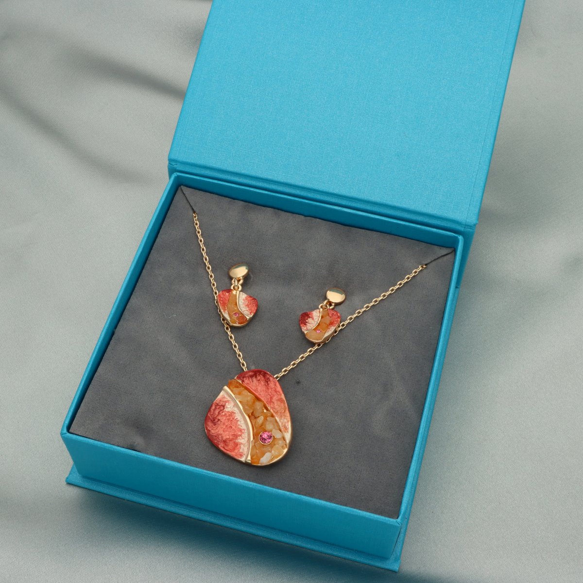 Zestaw (naszyjnik krótki i kolczyki) biżuterii artystycznej, ręcznie emaliowanej. Całość wykonana z antyalergicznego metalu. W eleganckim pudełku. Szukaj do kompletu bransoletki o tym samym indeksie numerycznym.