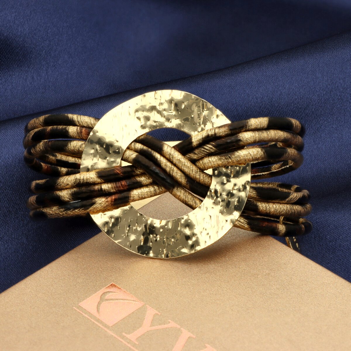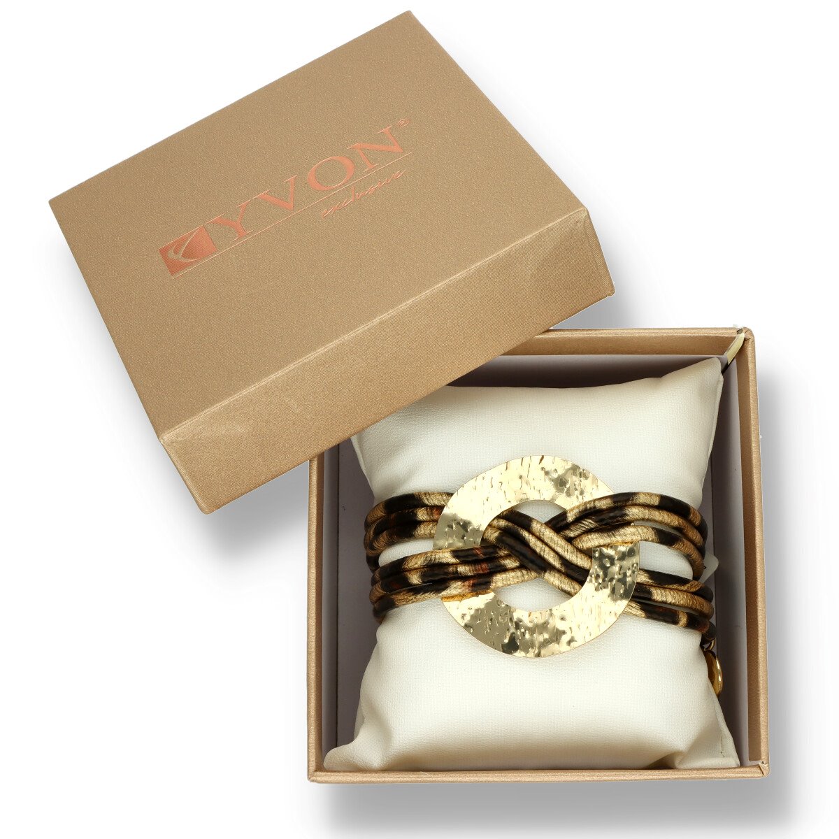 Elegancka bransoletka wykonana z wysokiej jakości skóry eko, zaprojektowana z myślą o nowoczesnych kobietach ceniących styl i wygodę. Wielowarstwowa struktura i metalowe akcenty nadają jej wyrazisty, ale ponadczasowy charakter. Zapięcie na mocny i wygodny magnes zapewnia szybkie zakładanie oraz stabilne trzymanie na nadgarstku. Elementy metalowe wykonane są z metalu hipoalergicznego (zamak i mosiądz), bezpiecznego dla skóry. Bransoletka zapakowana jest w eleganckie pudełeczko (gratis), dzięki czemu doskonale sprawdzi się również jako gotowy pomysł na prezent.