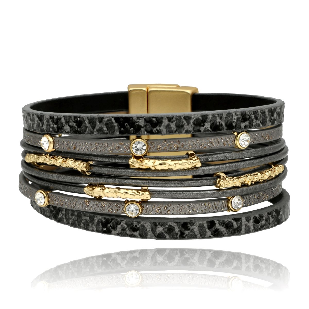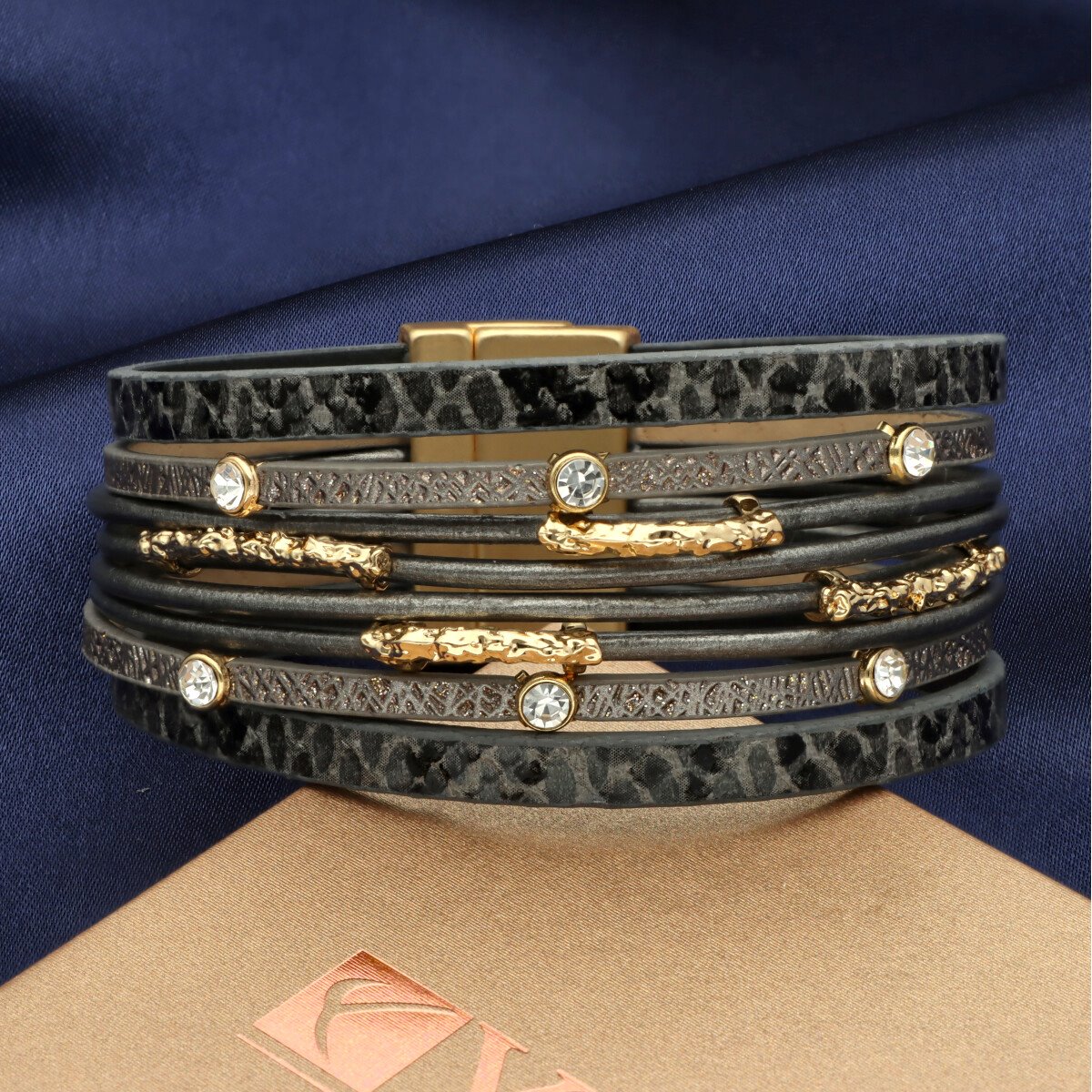 Elegancka bransoletka wykonana z wysokiej jakości skóry naturalnej i eko, zaprojektowana z myślą o nowoczesnych kobietach ceniących styl i wygodę. Wielowarstwowa struktura i metalowe akcenty nadają jej wyrazisty, ale ponadczasowy charakter. Zapięcie na mocny i wygodny magnes zapewnia szybkie zakładanie oraz stabilne trzymanie na nadgarstku. Elementy metalowe wykonane są z metalu hipoalergicznego (zamak i mosiądz), bezpiecznego dla skóry. Bransoletka zapakowana jest w eleganckie pudełeczko (gratis), dzięki czemu doskonale sprawdzi się również jako gotowy pomysł na prezent.