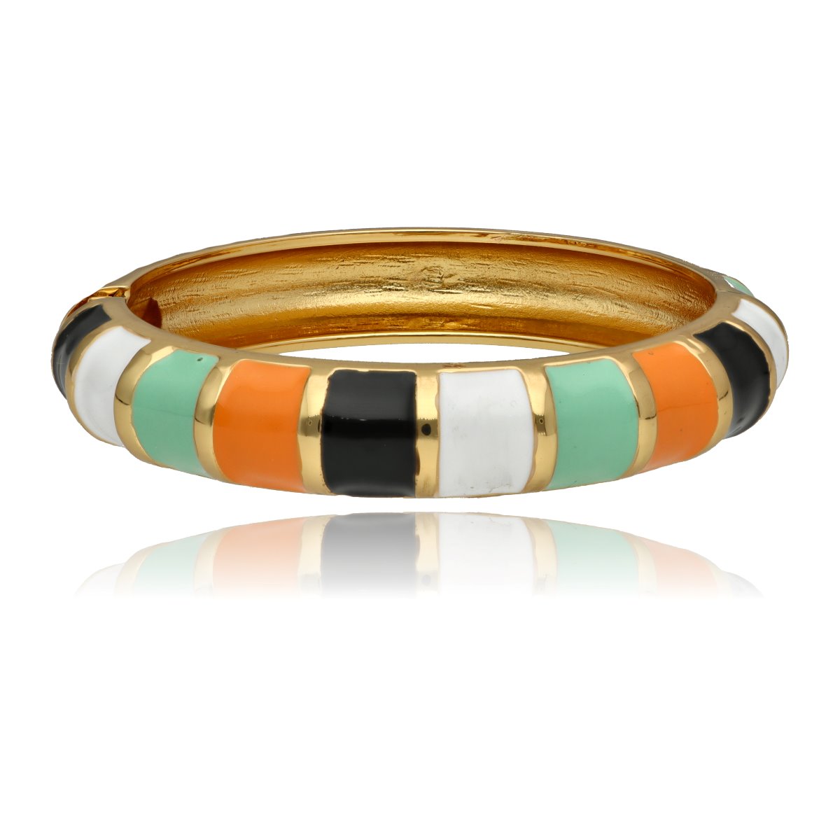 Opis produktu Stylowa bransoletka marki YVON to połączenie nowoczesnego designu z ponadczasową elegancją. Wyróżnia się geometrycznym wzorem z kolorową emalią, która nadaje jej charakteru i sprawia, że każda stylizacja zyskuje modowy akcent. Wykonana z wysokiej jakości metalu hipoalergicznego (zamak), jest bezpieczna dla skóry i komfortowa w codziennym noszeniu. Starannie wykończona powierzchnia oraz zestawienia kolorystyczne tworzą spójną, elegancką całość – od stonowanych po bardziej wyraziste warianty. Bransoletka posiada praktyczne, rozchylane zapięcie, które umożliwia szybkie i wygodne zakładanie oraz dopasowanie do nadgarstka. Dzięki temu model jest uniwersalny i doskonale sprawdzi się zarówno na co dzień, jak i jako uzupełnienie bardziej eleganckich stylizacji. To biżuteria dla kobiet, które lubią subtelny, ale zauważalny detal.