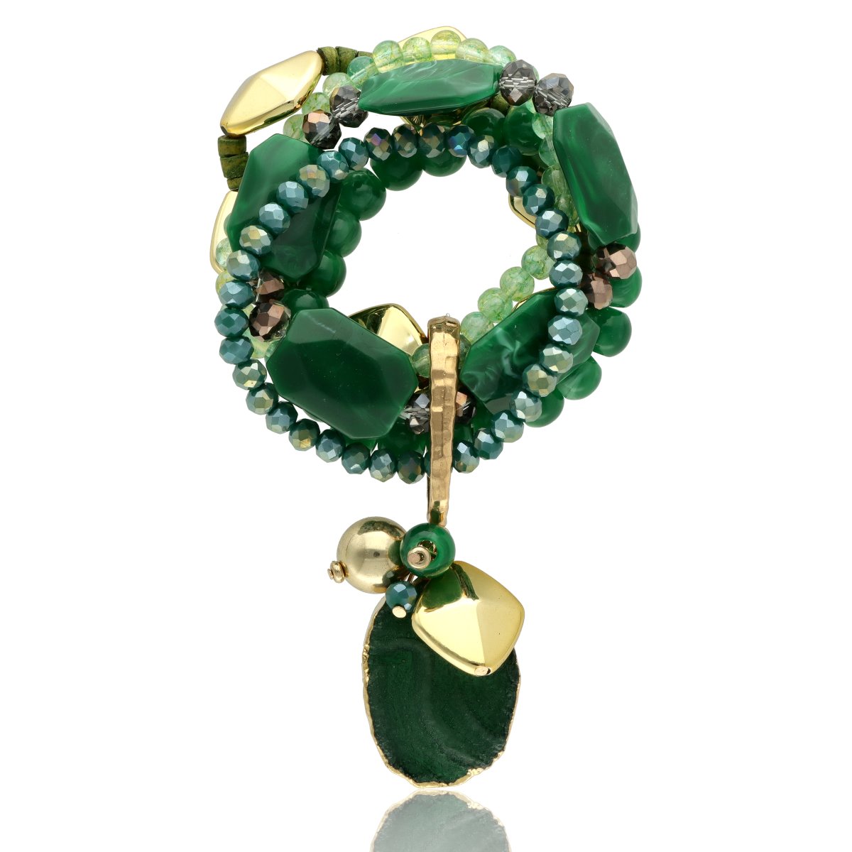Efektowna, wielorzędowa bransoleta YVON to propozycja dla kobiet, które lubią wyrazistą i niebanalną biżuterię. Ten model zachwyca bogactwem form i struktur – łączy w sobie metal w kolorze złotym, szkło fasetowane, elementy drewniane oraz naturalne kamienie, takie jak marmur zielony żyłkowany.