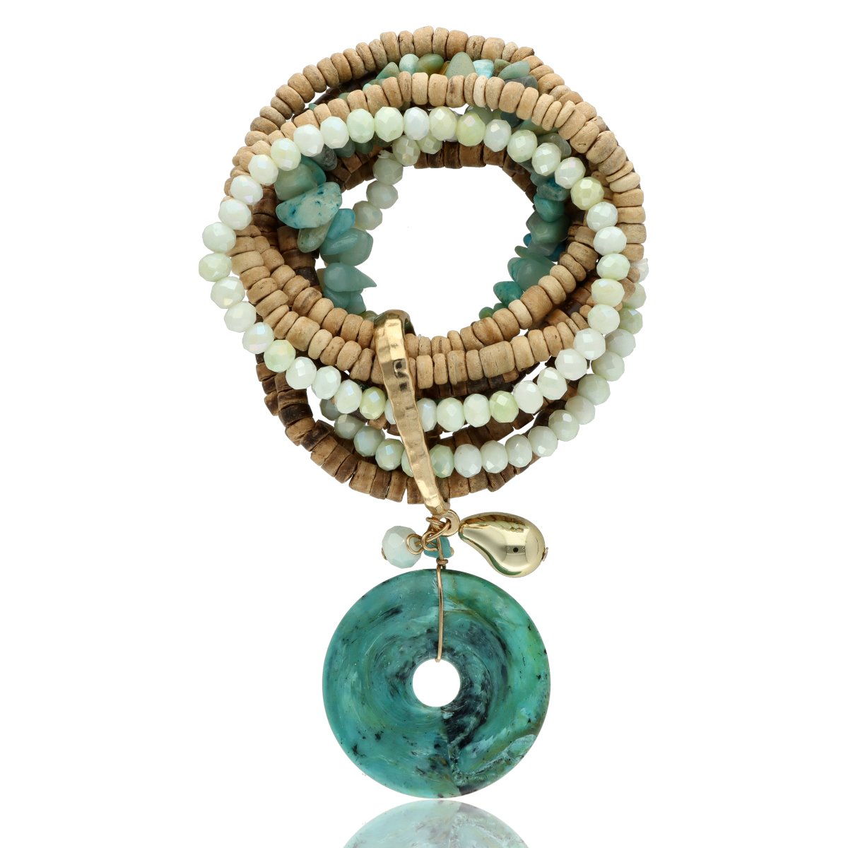 Różnorodność materiałów tworzy spójną, ale bardzo designerską kompozycję – od połyskujących, szklanych detali, przez ciepłe drewno, aż po unikalne, naturalne wybarwienia kamieni. Całość uzupełnia dekoracyjna zawieszka, która przyciąga uwagę i nadaje bransoletce wyjątkowego charakteru.