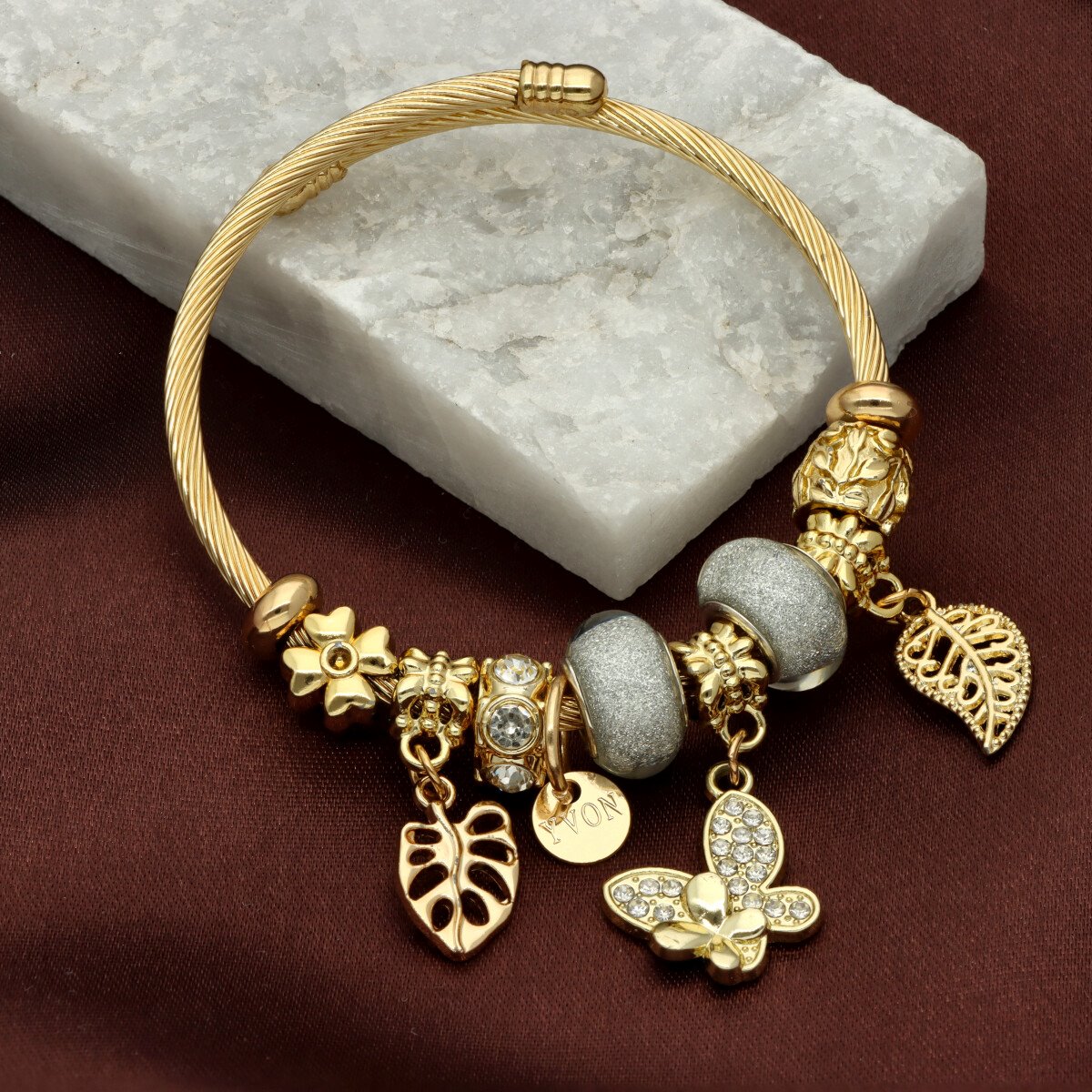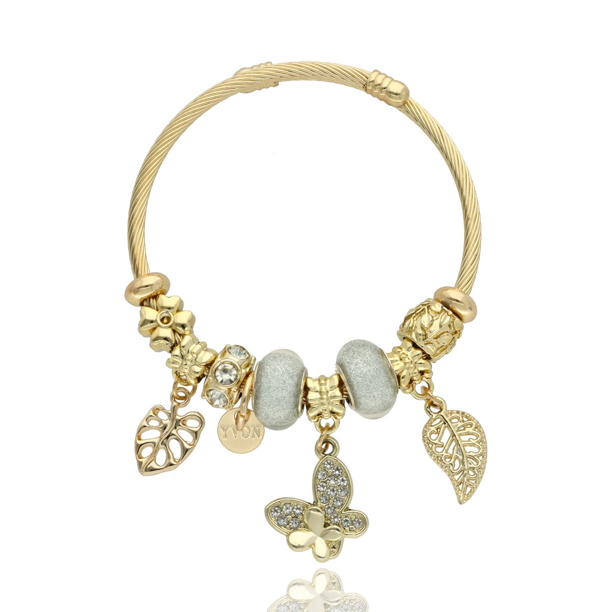 Urocza bransoletka wykonana ze stali szlachetnej (obręcz) oraz zamaku, szkła fasetowanego, ceramiki i emalii (czarmsy). W eleganckim PUDEŁECZKU GRATIS - idealny pomysł na prezent. Biżuteria hypoalergiczna.