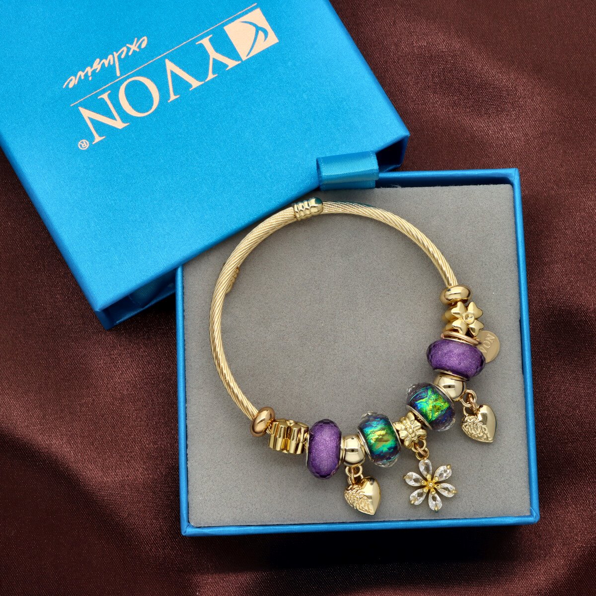 Urocza bransoletka wykonana ze stali szlachetnej (obręcz) oraz zamaku, szkła fasetowanego, ceramiki i emalii (czarmsy). W eleganckim PUDEŁECZKU GRATIS - idealny pomysł na prezent. Biżuteria hypoalergiczna.