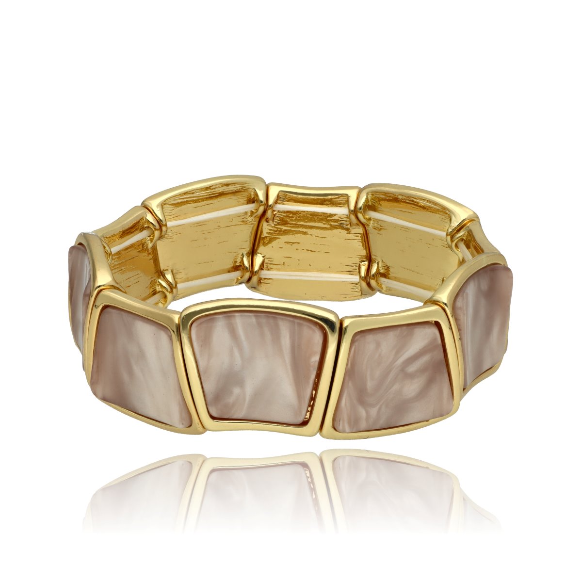 Uniwersalna, rozciągliwa bransoletka wykonana z metalu (zamak) i elementu z kolorowej żywicy. Osadzona na elastycznej gumce, dopasowuje się do większości nadgarstków, zapewniając komfort i wygodę noszenia.