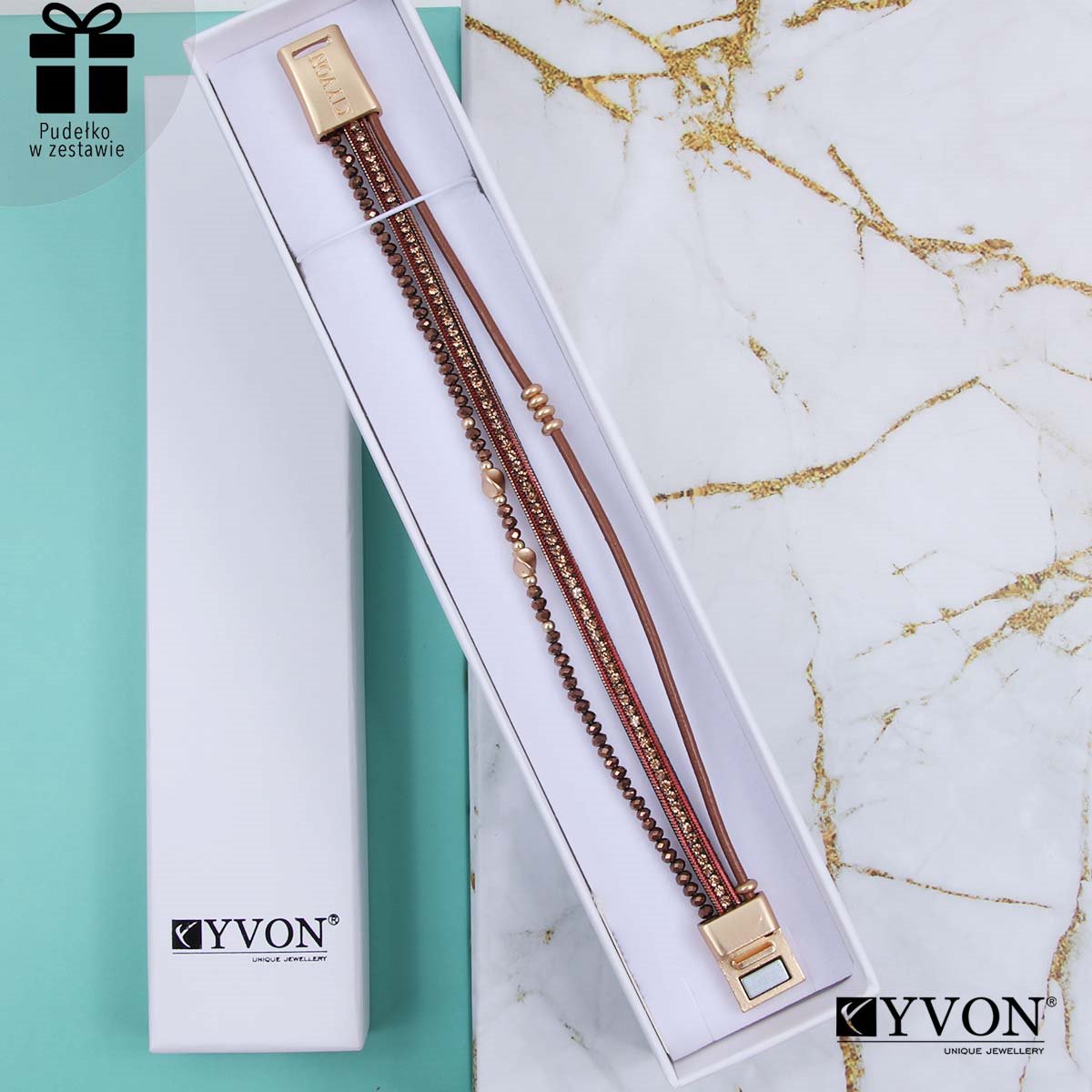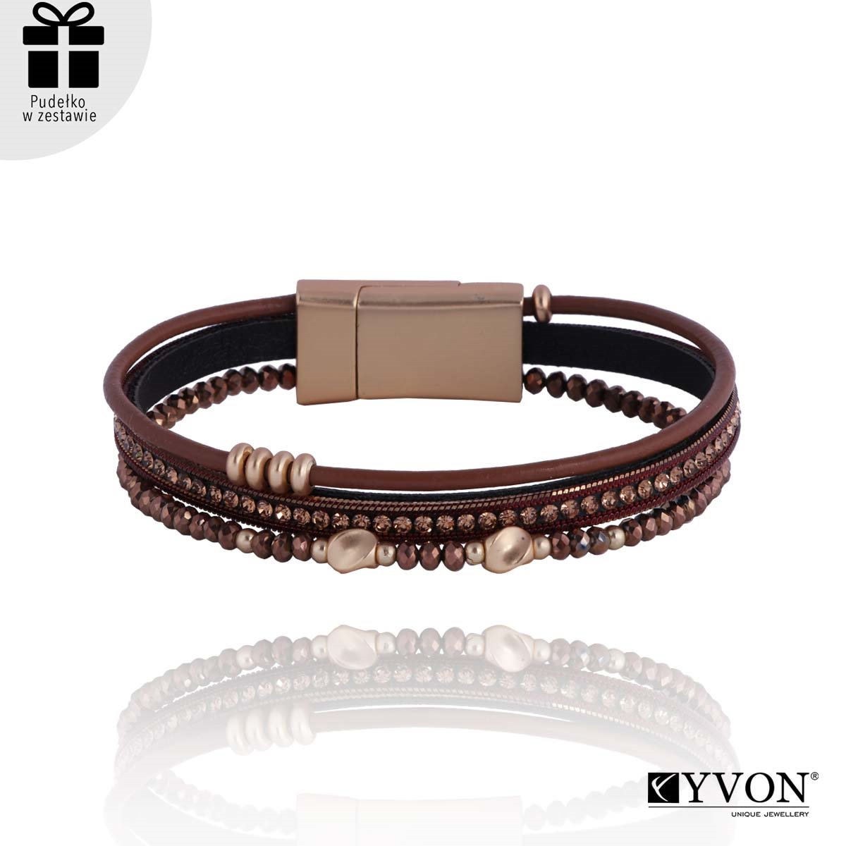 Szalenie elegancka bransoletka w stylu BOHO, wykonana z najwyższej jakości skóry naturalnej, szklanych kryształów i metalu antyalergicznego. Zapinana na wygodny magnes. Znakomite uzupełnienie codziennych stylizacji. Biżuteria YVON® jest w 100% antyalergiczna. W zestawie z ekskluzywnym PUDEŁECZKIEM GRATIS!