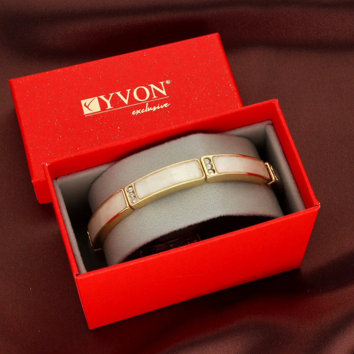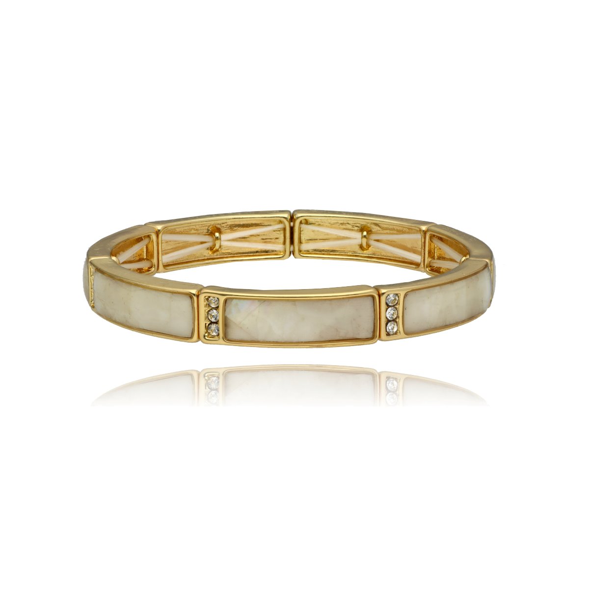 Stylowa bransoletka na elastycznej gumce, wykonana z metalowych, antyalergicznych elementów i muszli naturalnej mlecznej.