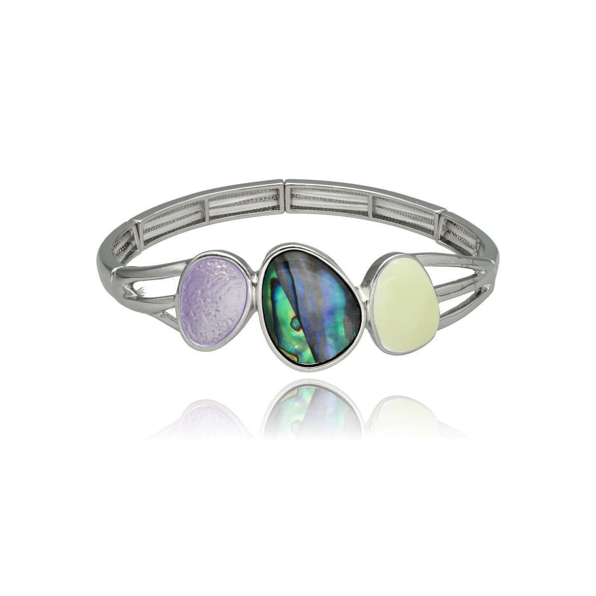 Bransoletka z ozdobnym, 3-elementowym motywem o nieregularnych, płynnych kształtach, wykonana na rozciągliwych gumkach, co zapewnia wygodę noszenia i naturalne dopasowanie do nadgarstka.