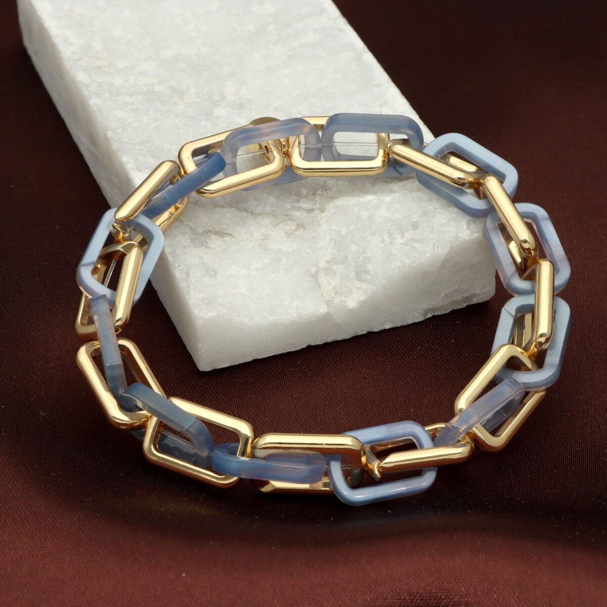 Bransoletka wykonana z wysokiej jakości zamaku (hypoalergiczny stop cynku) oraz barwionej żywicy w ciepłych odcieniach kolorów ziemi. Ogniwa o eleganckim kształcie układają się w efektowną całość, tworząc biżuterię uniwersalną i pełną nowoczesnego wdzięku. Bransoletka została osadzona na rozciągliwych żyłkach, dzięki czemu posiada rozmiar uniwersalny, wygodnie dopasowując się do nadgarstka.