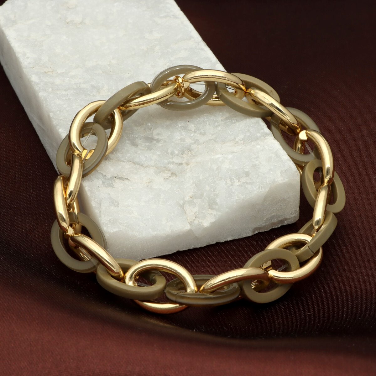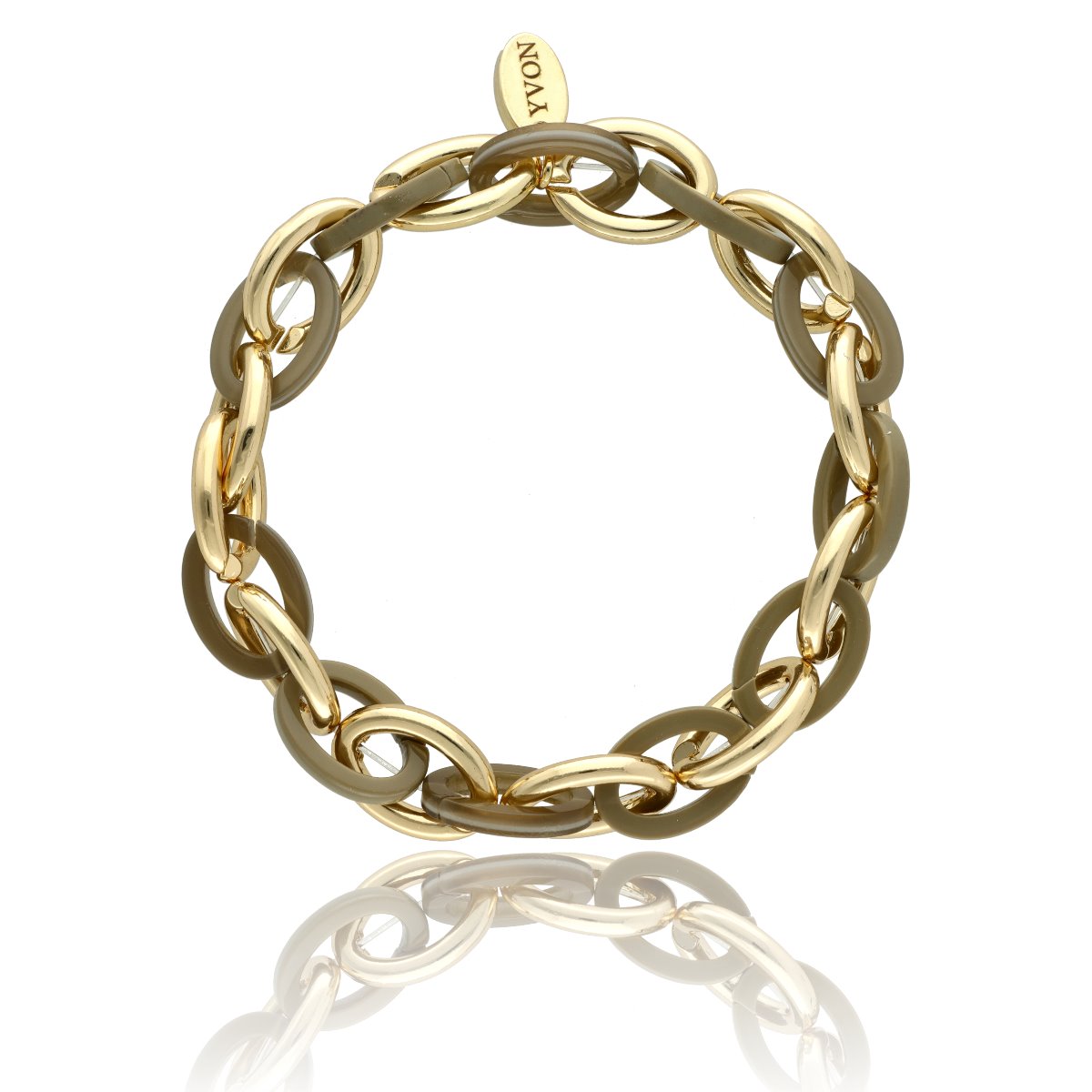 Bransoletka wykonana z wysokiej jakości zamaku (hypoalergiczny stop cynku) oraz barwionej żywicy w ciepłych odcieniach kolorów ziemi. Ogniwa o eleganckim kształcie układają się w efektowną całość, tworząc biżuterię uniwersalną i pełną nowoczesnego wdzięku. Bransoletka została osadzona na rozciągliwych żyłkach, dzięki czemu posiada rozmiar uniwersalny, wygodnie dopasowując się do nadgarstka.