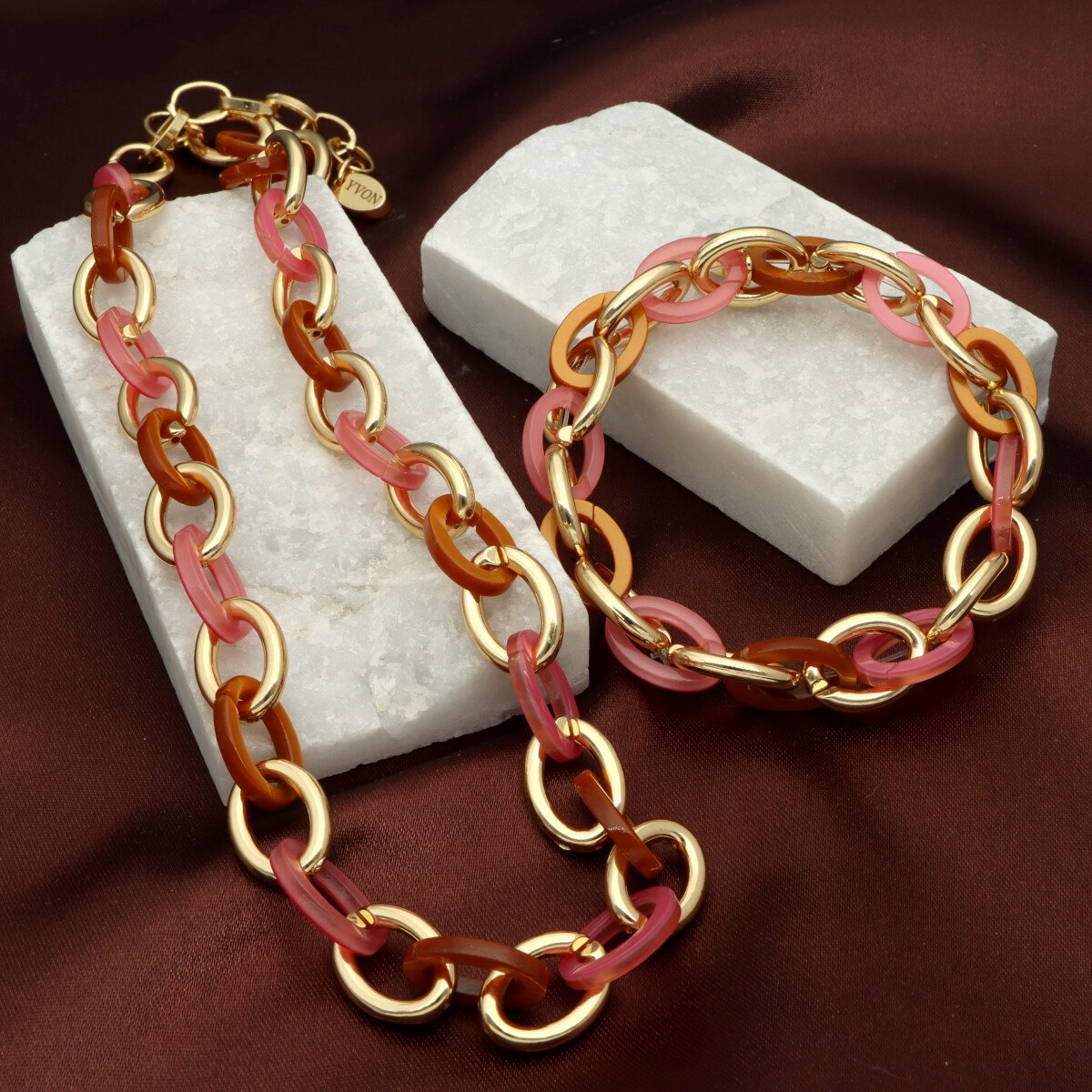 Bransoletka wykonana z wysokiej jakości zamaku (hypoalergiczny stop cynku) oraz barwionej żywicy w ciepłych odcieniach kolorów ziemi. Ogniwa o eleganckim kształcie układają się w efektowną całość, tworząc biżuterię uniwersalną i pełną nowoczesnego wdzięku. Bransoletka została osadzona na rozciągliwych żyłkach, dzięki czemu posiada rozmiar uniwersalny, wygodnie dopasowując się do nadgarstka.