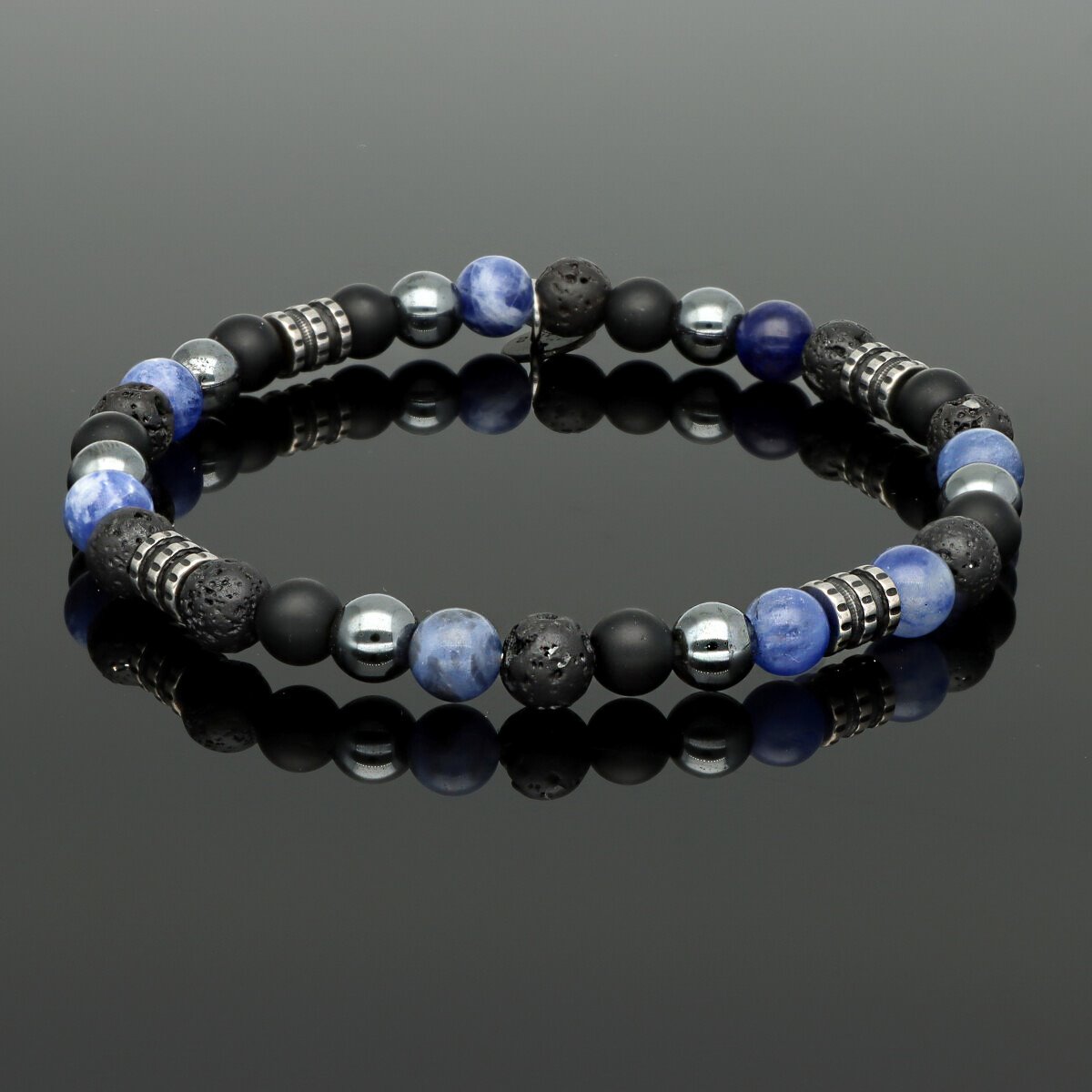 Bransoletka męska YVES wykonana z naturalnych kamieni (lapis Lazuri, lawa, agat, hematyt) zestawionych ze stalą szlachetną. Osadzona na wytrzymałych, elastycznych gumkach, dzięki czemu dopasowuje się do każdego nadgarstka. W pełni antyalergiczna, komfortowa w noszeniu. Bransoletka pakowana w eleganckie pudełko, idealna zarówno na co dzień, jak i w formie prezentu. Stanowi komplet z naszyjnikiem o tym samym indeksie.
