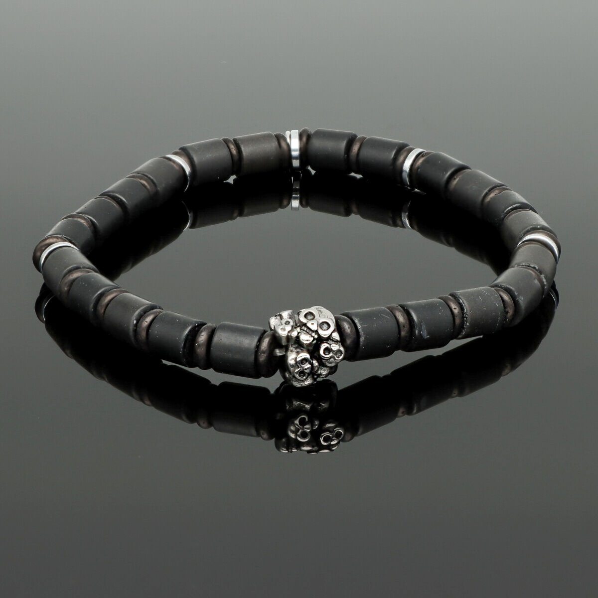 Bransoletka męska YVES wykonana z naturalnych kamieni (agat czarny) zestawionych ze stalą szlachetną. Osadzona na wytrzymałych, elastycznych gumkach, dzięki czemu dopasowuje się do każdego nadgarstka. W pełni antyalergiczna, komfortowa w noszeniu. Bransoletka pakowana w eleganckie pudełko, idealna zarówno na co dzień, jak i w formie prezentu. Stanowi komplet z naszyjnikiem o tym samym indeksie.