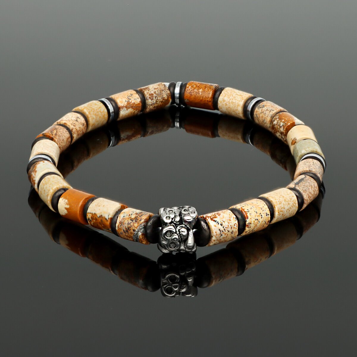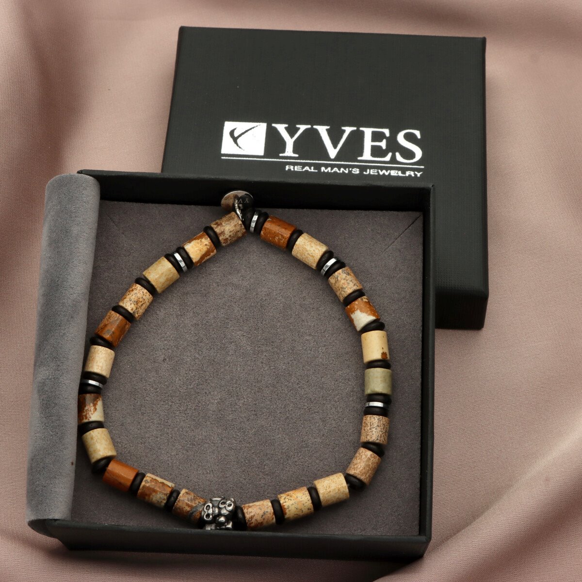 Bransoletka męska YVES wykonana z naturalnych kamieni (jaspis obrazkowy) zestawionych ze stalą szlachetną. Osadzona na wytrzymałych, elastycznych gumkach, dzięki czemu dopasowuje się do każdego nadgarstka. W pełni antyalergiczna, komfortowa w noszeniu. Bransoletka pakowana w eleganckie pudełko, idealna zarówno na co dzień, jak i w formie prezentu. Stanowi komplet z naszyjnikiem o tym samym indeksie.