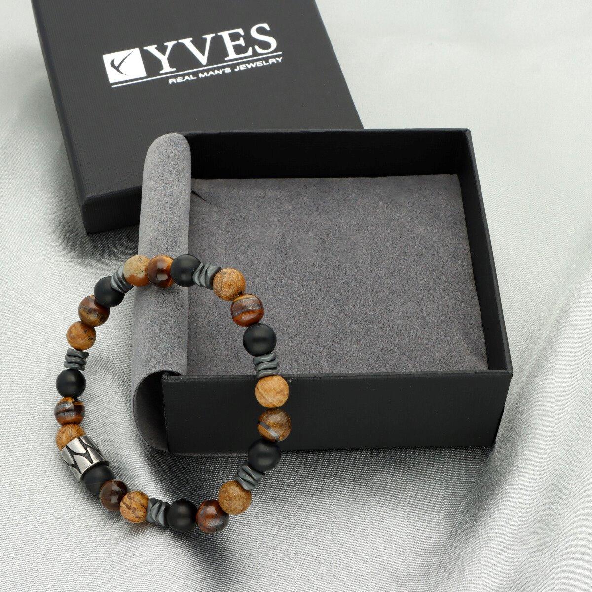 Ekskluzywna męska bransoletka z najnowszej kolekcji YVES. Wykonana z najwyższej jakości materiałów: stali szlachetnej 316L oraz kamieni naturalnych (TYGRYSIE OKO, ONYKS, HEMATYT). Wielkość kamieni: 8mm. Produkt antyalergiczny. W eleganckim PUDEŁKU GRATIS. Spraw, aby Twój prezent wyglądał jeszcze bardziej ekskluzywnie - polecamy torebeczki do męskiej biżuterii o symbolu P5018.