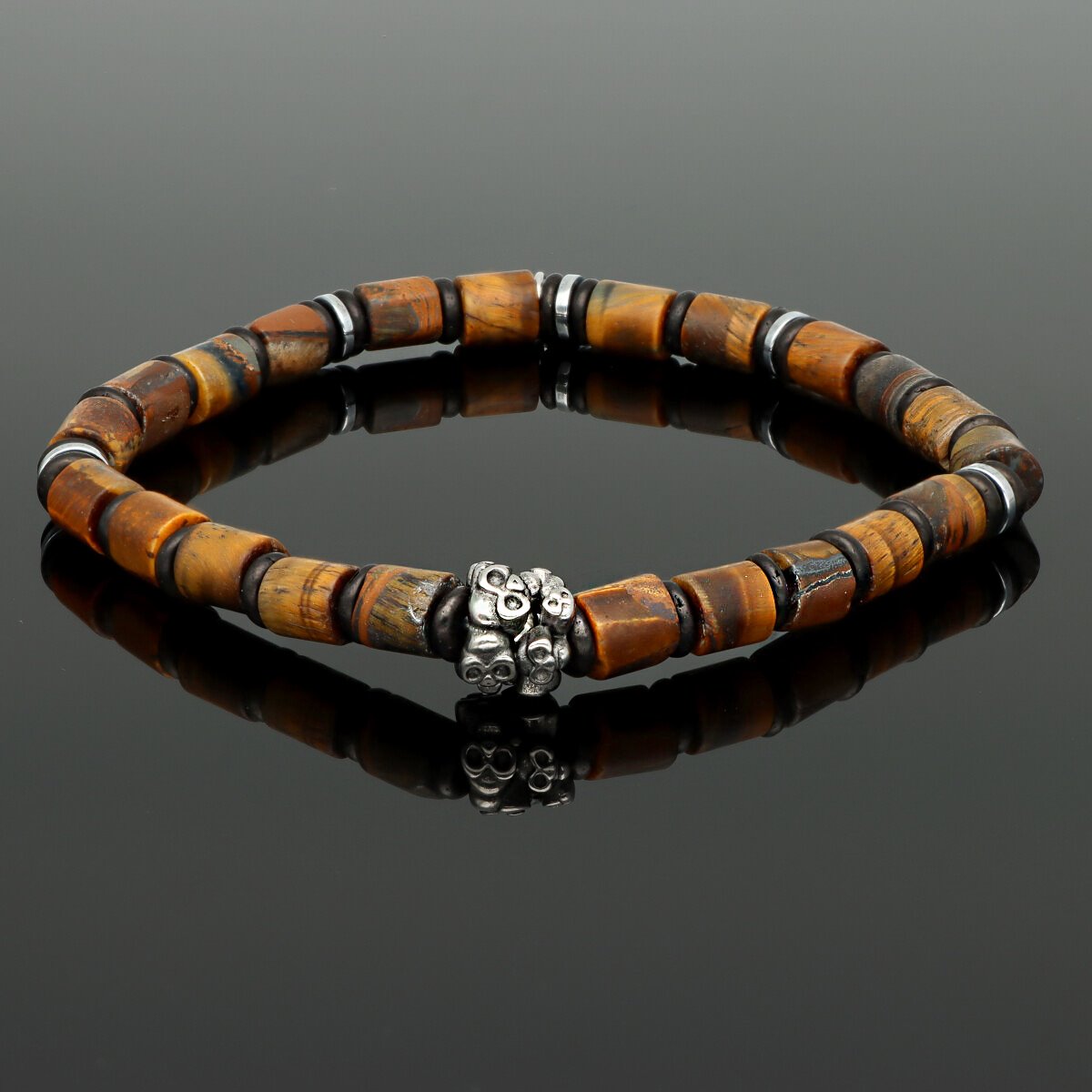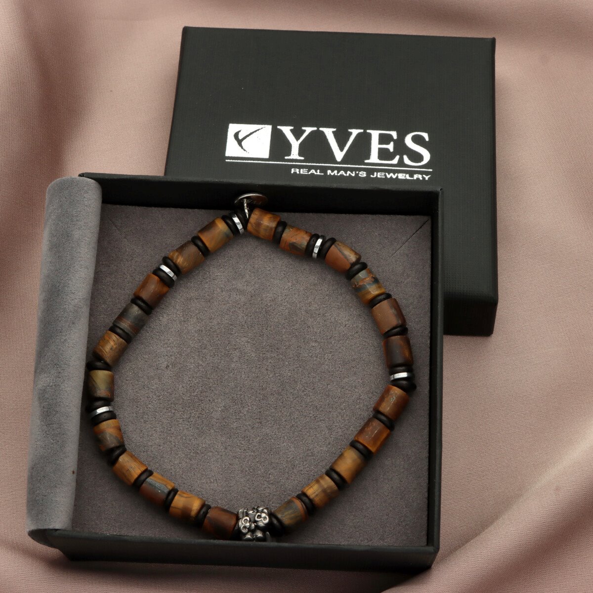 Bransoletka męska YVES wykonana z naturalnych kamieni (tiger eye) zestawionych ze stalą szlachetną. Osadzona na wytrzymałych, elastycznych gumkach, dzięki czemu dopasowuje się do każdego nadgarstka. W pełni antyalergiczna, komfortowa w noszeniu. Bransoletka pakowana w eleganckie pudełko, idealna zarówno na co dzień, jak i w formie prezentu. Stanowi komplet z naszyjnikiem o tym samym indeksie.