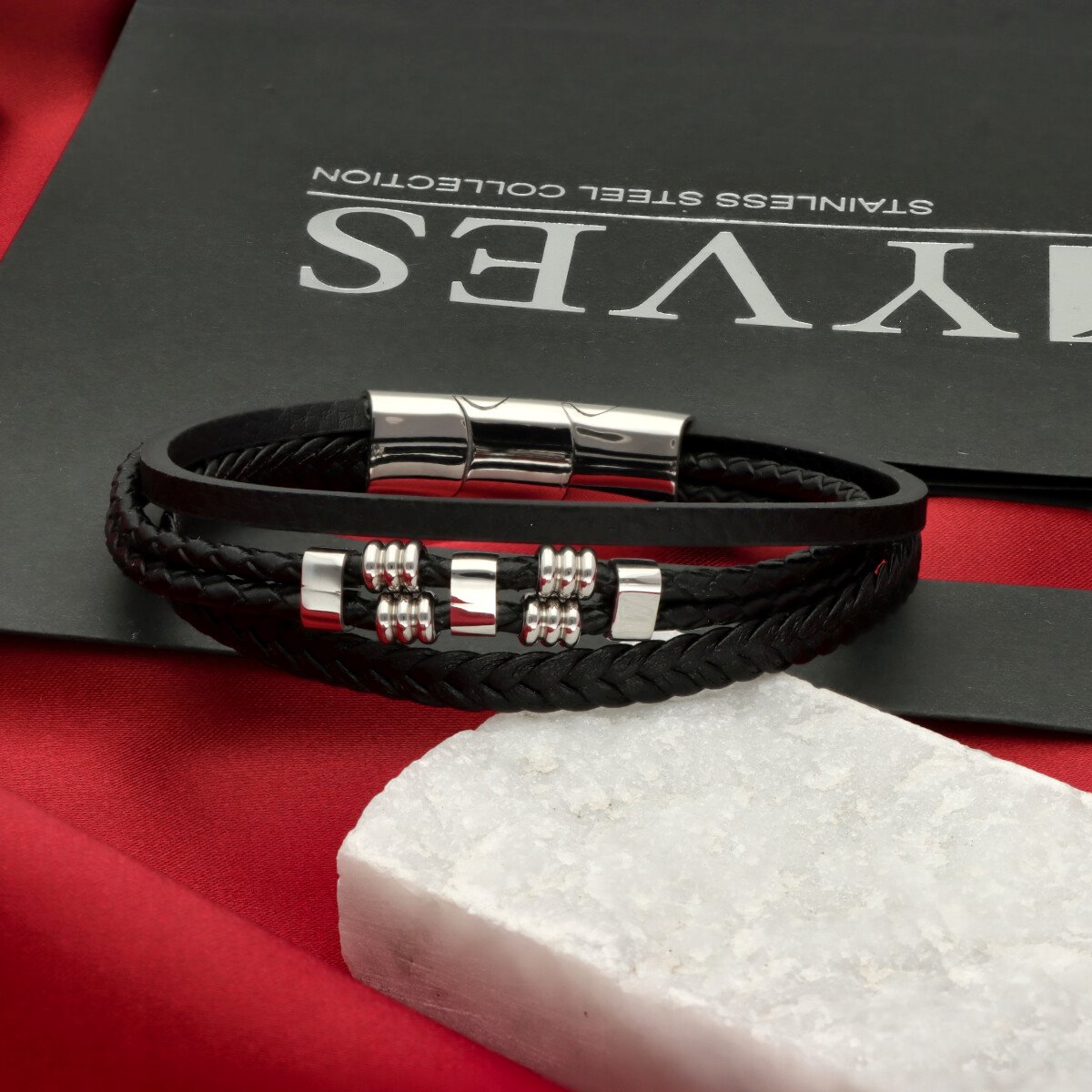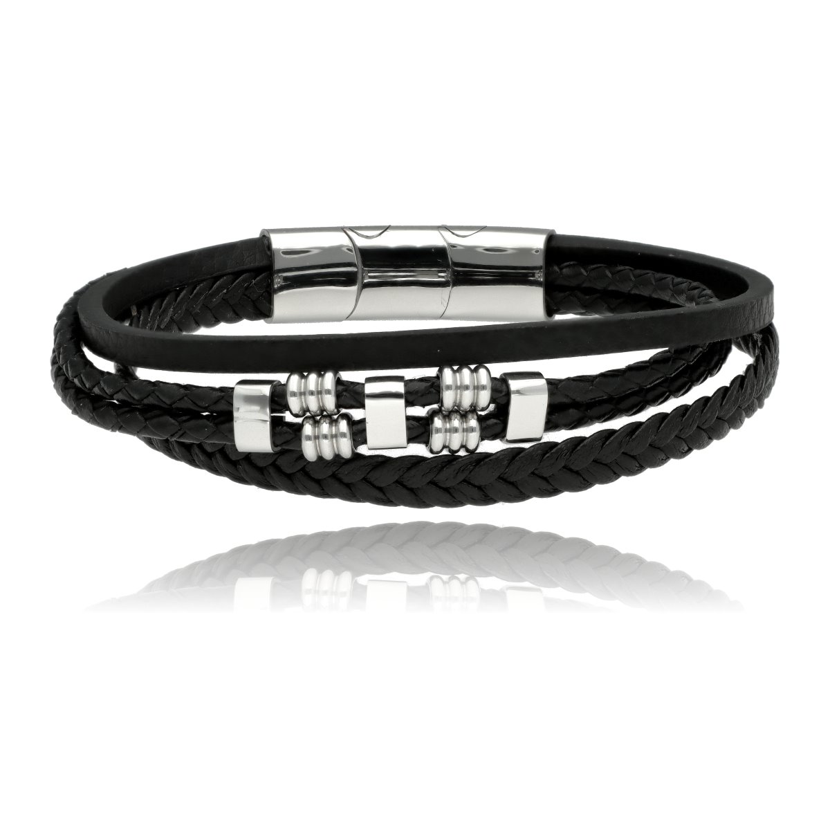 Męska bransoleta wykonana z naturalnej skóry oraz stali szlachetnej 316L, odpornej na uszkodzenia i hipoalergicznej. Prosty, nowoczesny design sprawia, że pasuje zarówno na co dzień, jak i do bardziej eleganckich stylizacji.