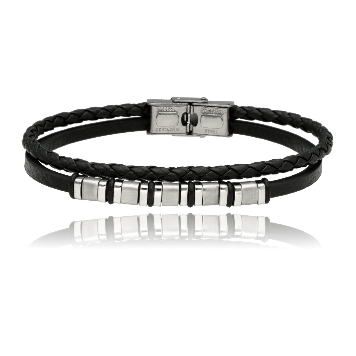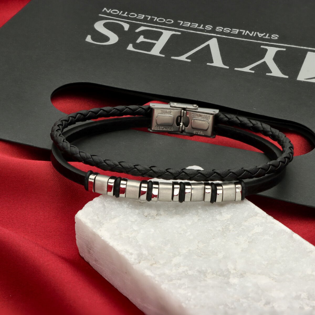 Męska bransoleta wykonana z naturalnej skóry oraz stali szlachetnej 316L, odpornej na uszkodzenia i hipoalergicznej. Prosty, nowoczesny design sprawia, że pasuje zarówno na co dzień, jak i do bardziej eleganckich stylizacji.