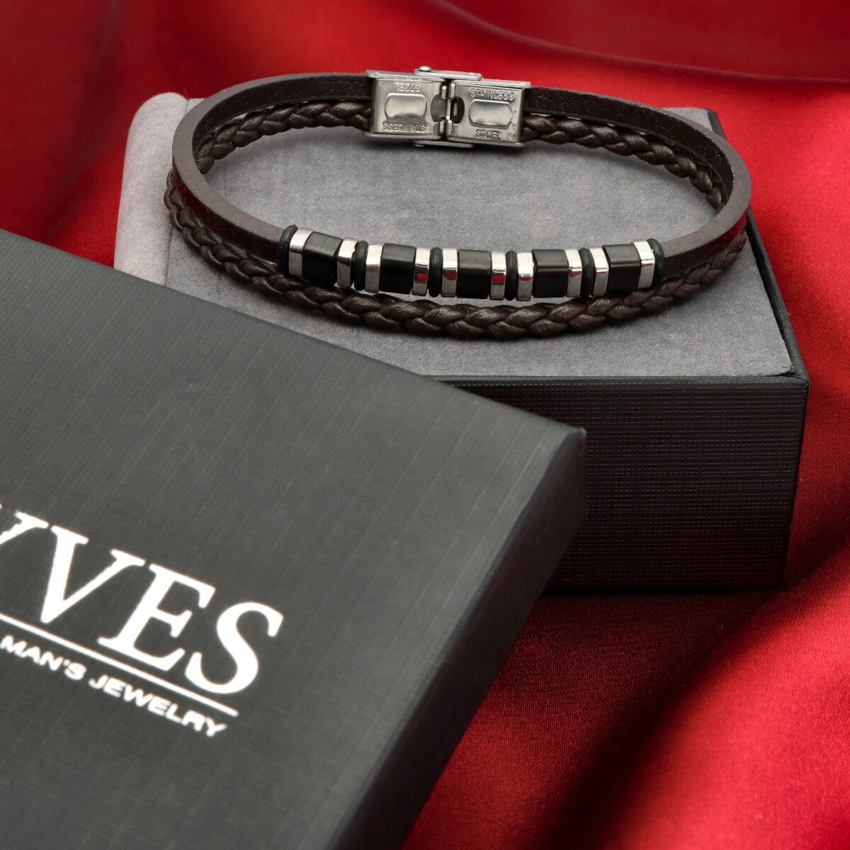 Męska bransoleta wykonana z naturalnej skóry oraz stali szlachetnej 316L, odpornej na uszkodzenia i hipoalergicznej. Prosty, nowoczesny design sprawia, że pasuje zarówno na co dzień, jak i do bardziej eleganckich stylizacji.