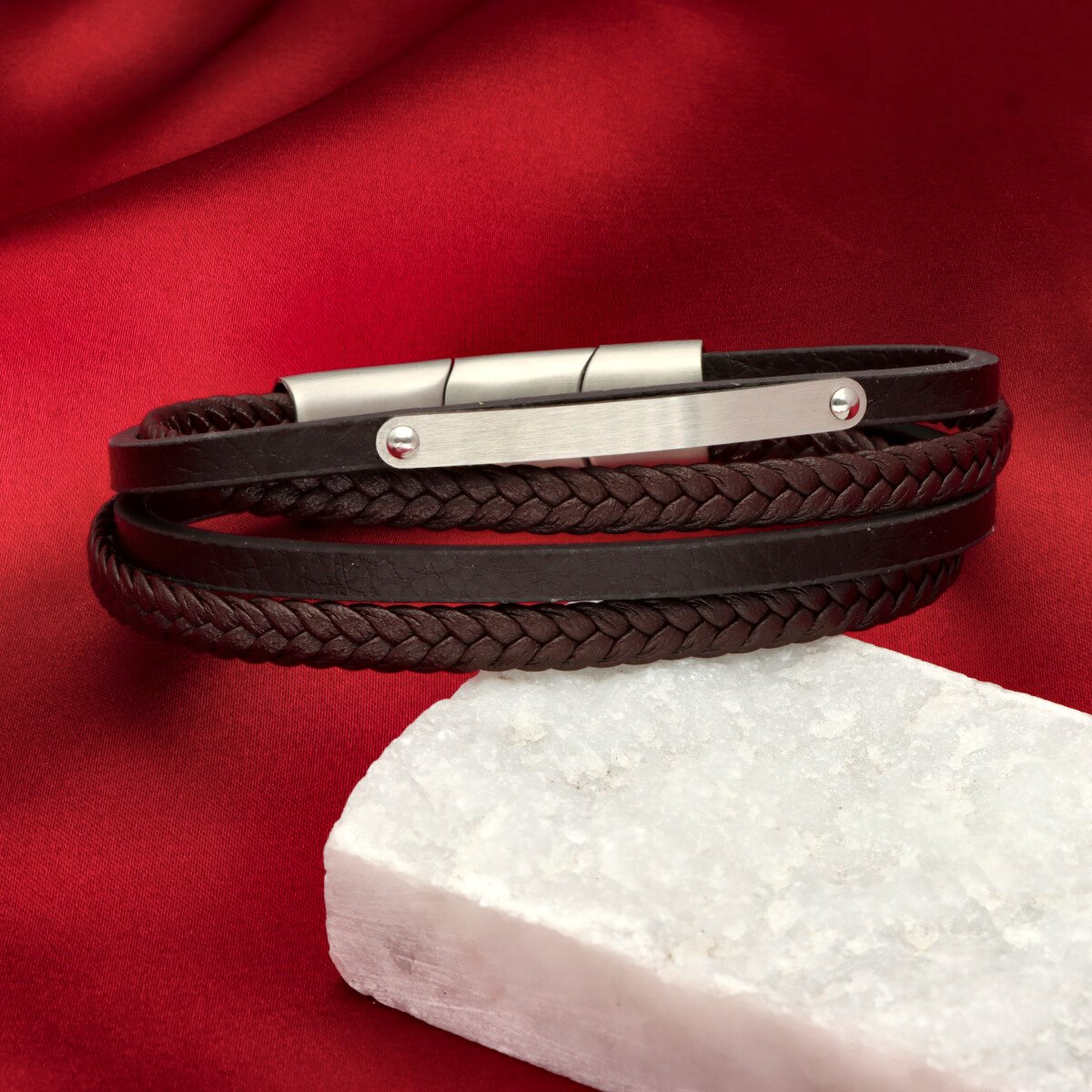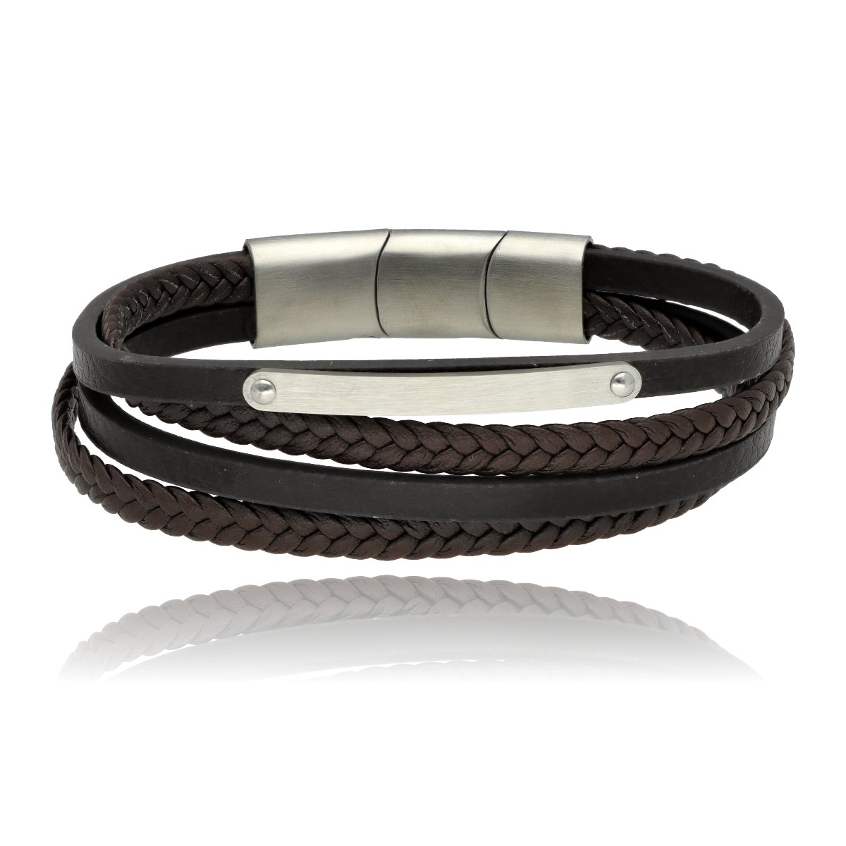 Męska bransoleta wykonana z naturalnej skóry oraz stali szlachetnej 316L, odpornej na uszkodzenia i hipoalergicznej. Prosty, nowoczesny design sprawia, że pasuje zarówno na co dzień, jak i do bardziej eleganckich stylizacji.