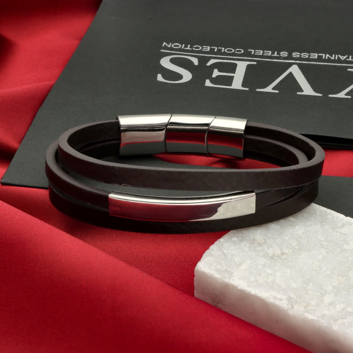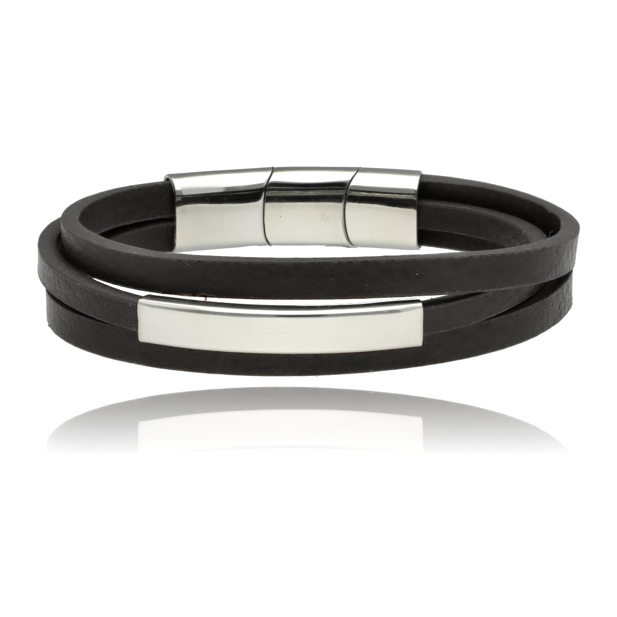 Męska bransoleta wykonana z naturalnej skóry oraz stali szlachetnej 316L, odpornej na uszkodzenia i hipoalergicznej. Prosty, nowoczesny design sprawia, że pasuje zarówno na co dzień, jak i do bardziej eleganckich stylizacji.
