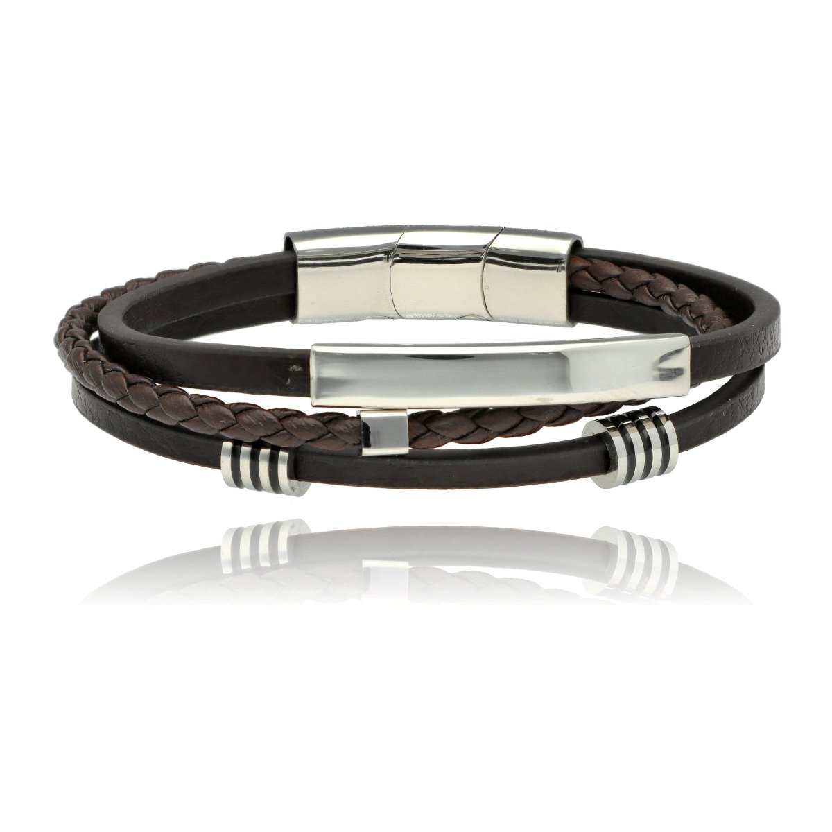 Męska bransoleta wykonana z naturalnej skóry oraz stali szlachetnej 316L, odpornej na uszkodzenia i hipoalergicznej. Prosty, nowoczesny design sprawia, że pasuje zarówno na co dzień, jak i do bardziej eleganckich stylizacji.