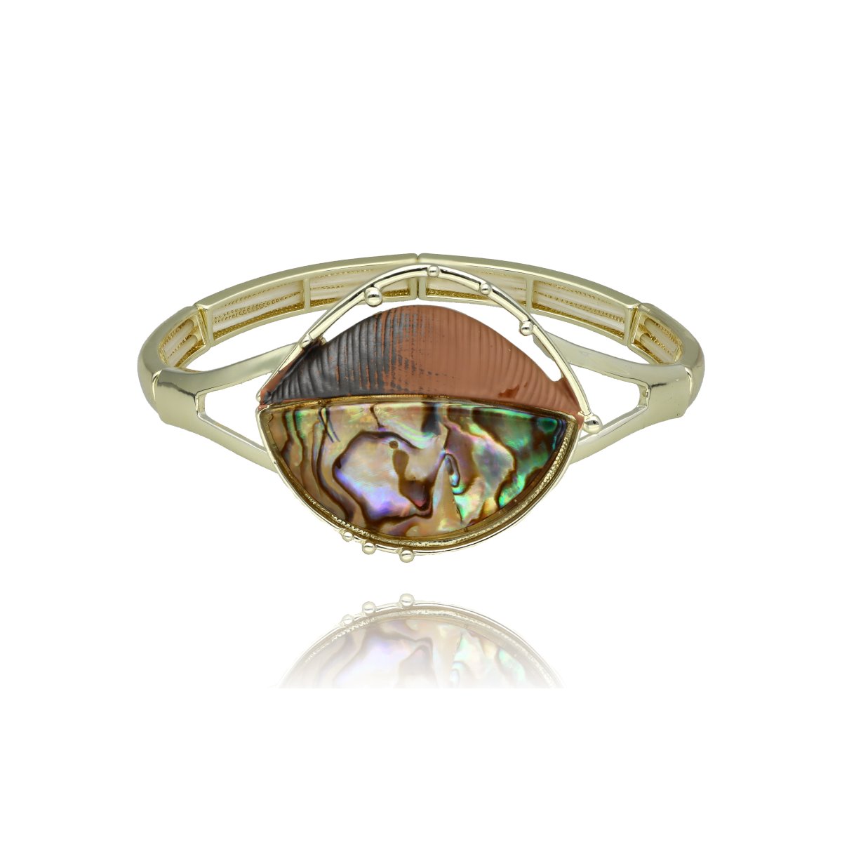 Bransoletka z ozdobnym motywem o nowoczesnej, geometrycznej formie, wykonana na rozciągliwych gumkach, co zapewnia wygodę noszenia i łatwe dopasowanie do nadgarstka.