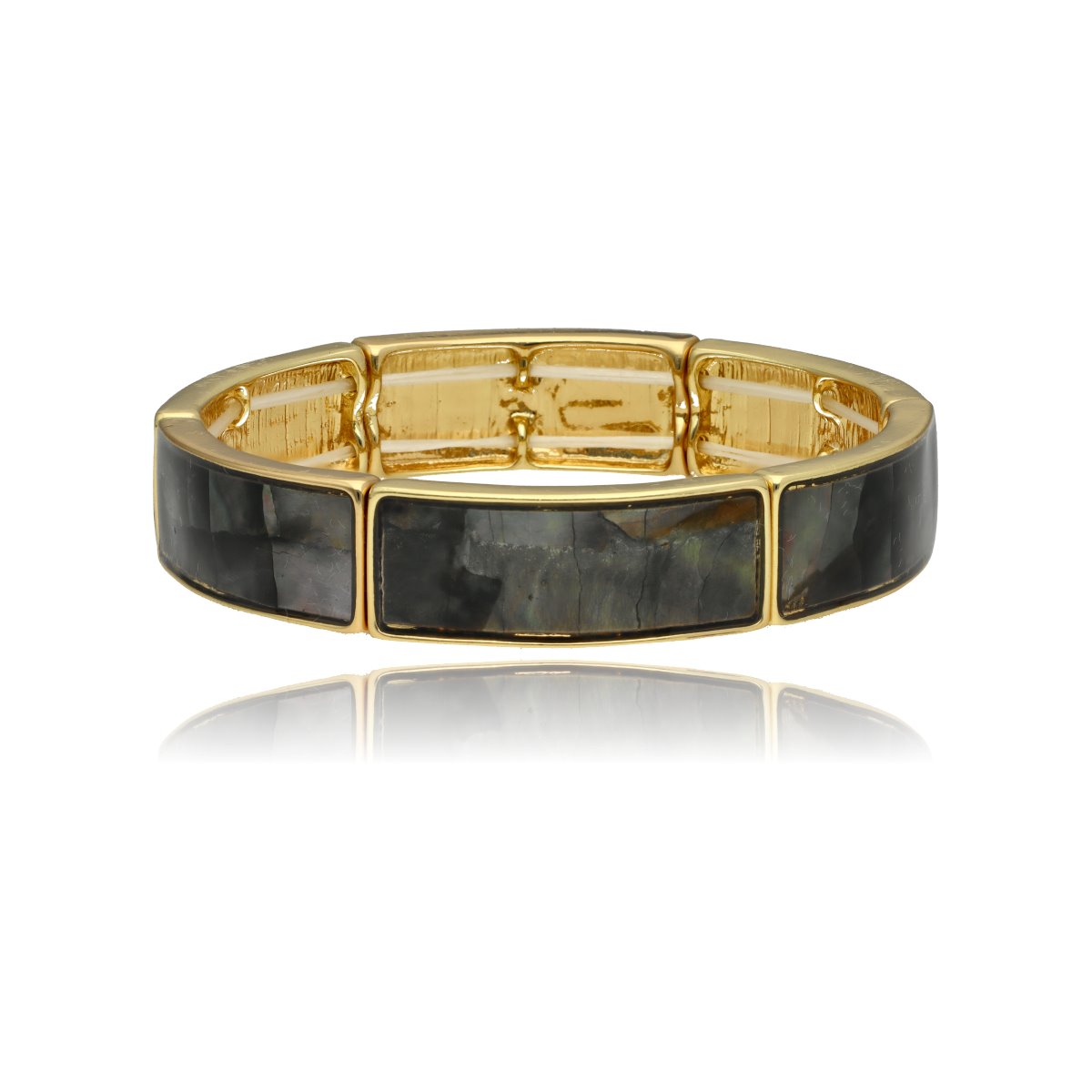 Stylowa bransoletka na elastycznej gumce, wykonana z metalowych, antyalergicznych elementów i muszli naturalnej szarej.