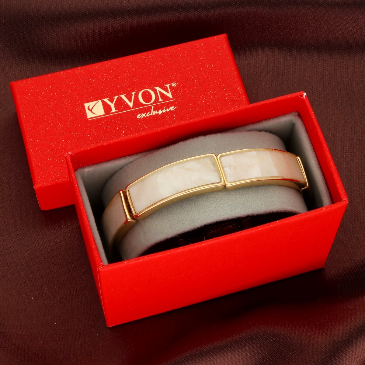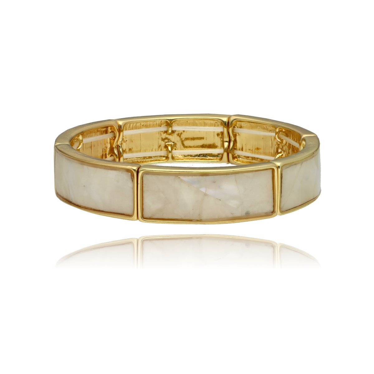 Stylowa bransoletka na elastycznej gumce, wykonana z metalowych, antyalergicznych elementów i muszli naturalnej mlecznej.