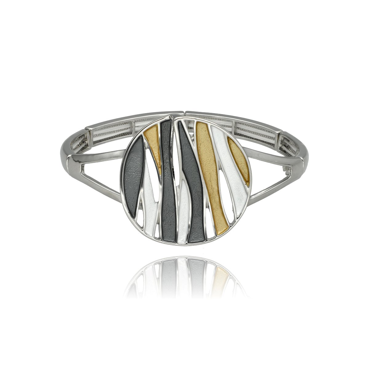 Opis produktu: Bransoletka z ozdobnym, okrągłym motywem o geometrycznym wzorze, wykonana na rozciągliwych gumkach, co zapewnia wygodę noszenia i łatwe dopasowanie do nadgarstka. Wykonana z hipoalergicznego metalu (zamak – stop cynku, bezpieczny dla wrażliwej skóry) oraz kolorowej emalii. Wyrazisty wzór sprawia, że biżuteria doskonale uzupełnia zarówno codzienne, jak i eleganckie stylizacje. Do produktu przewidzieliśmy pasujący naszyjnik i kolczyki o tym samym indeksie numerycznym.