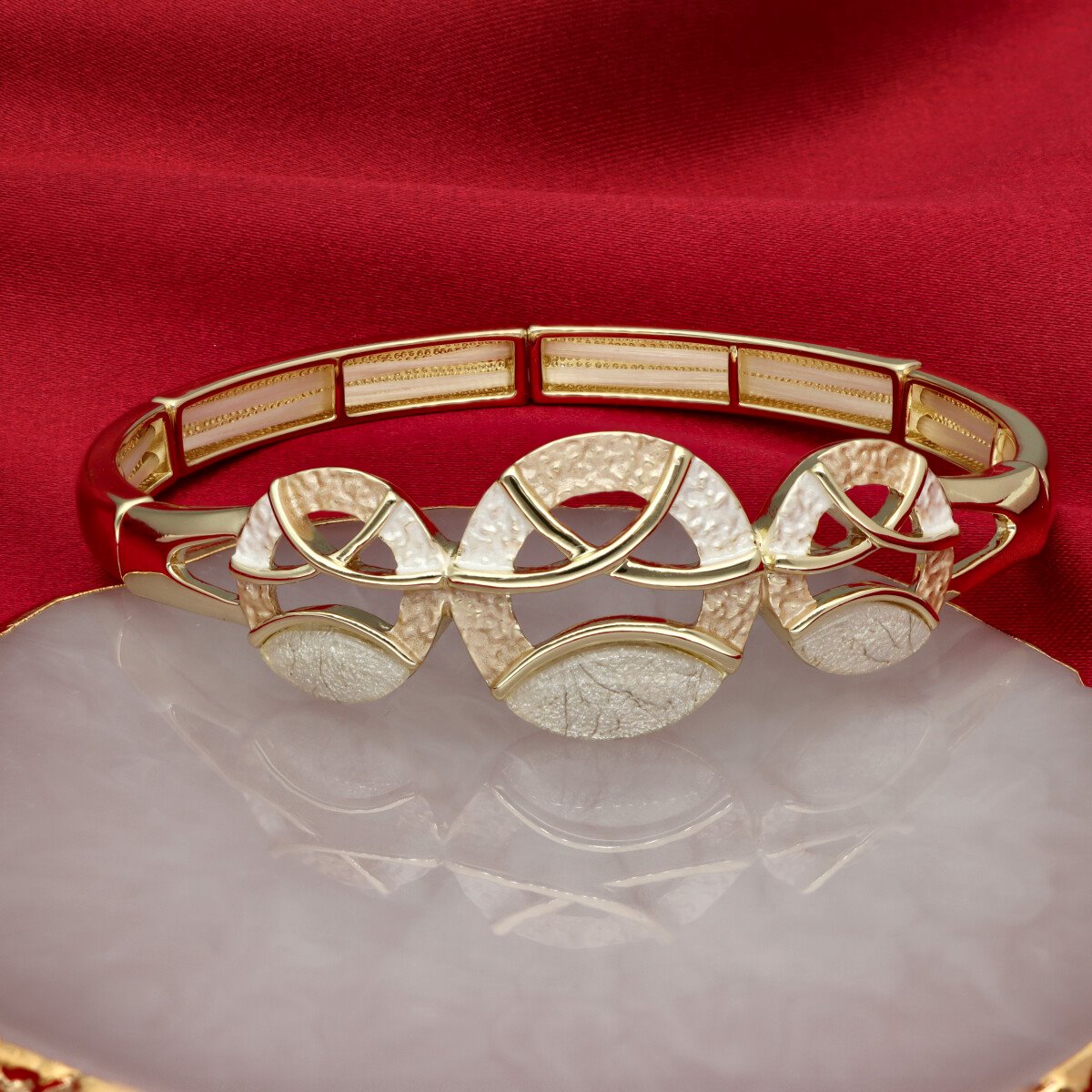 Elegancka bransoletka wykonana z metalu antyalergicznego i żywicy. Rozmiar uniwersalny (na rozciągliwych gumkach). Szukaj do kompletu naszyjnika i kolczyków o tym samym indeksie numerycznym.