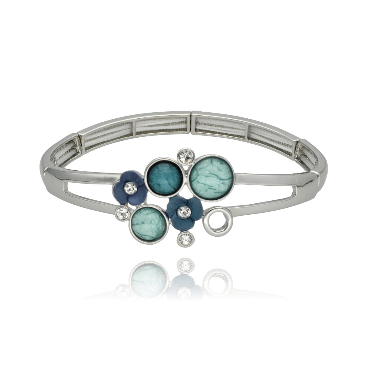 Elegancka bransoletka wykonana z metalu, żywicy jubilerskiej i emalii. Rozmiar uniwersalny (na rozciągliwych gumkach). Szukaj do kompletu naszyjnika i kolczyków o tym samym indeksie numerycznym.