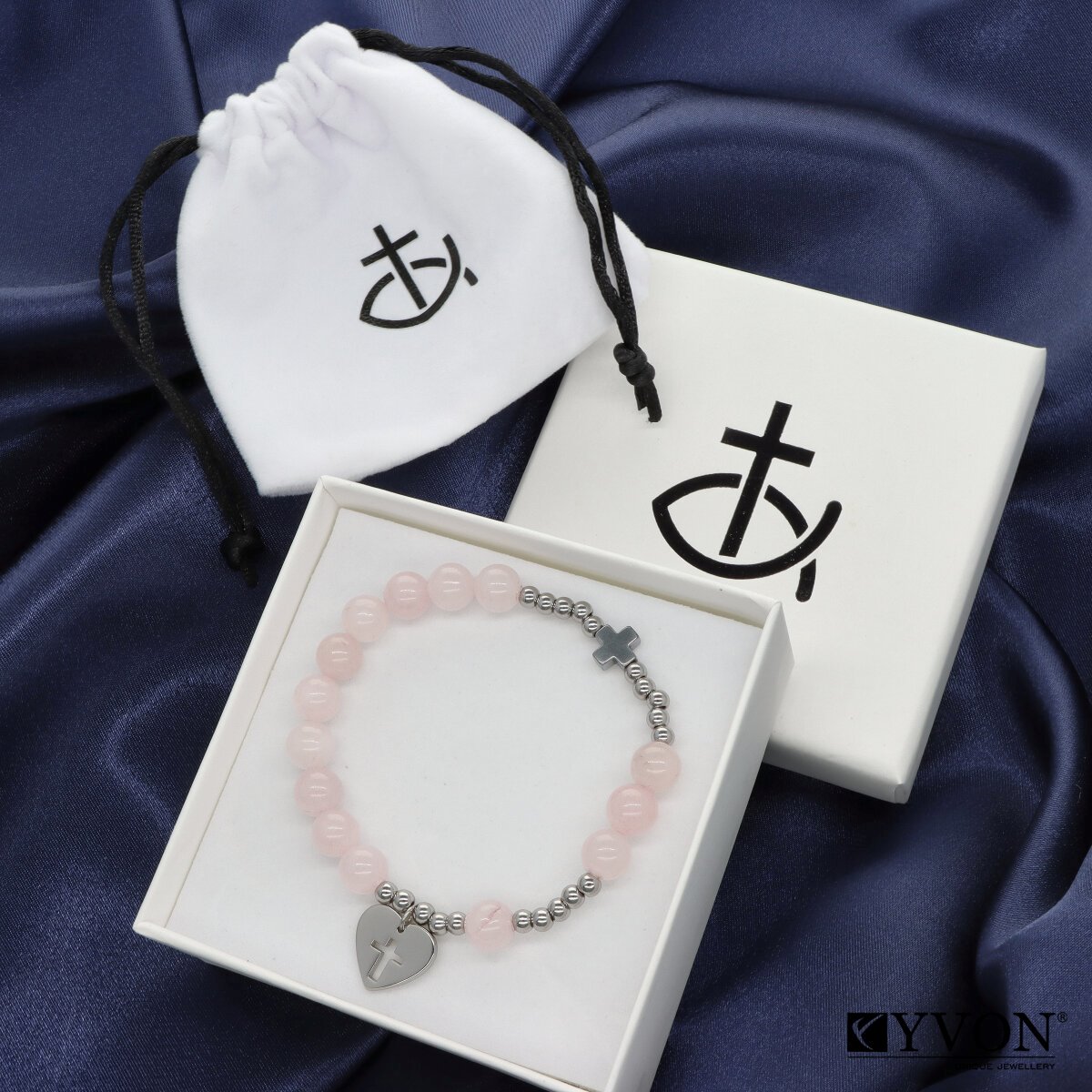 Idealny pomysł na prezent na Komunię Świętą. Różaniec - bransoletka z kamieni naturalnych, w eleganckim pudełeczku, w zestawie z sakiewką do przechowywania.