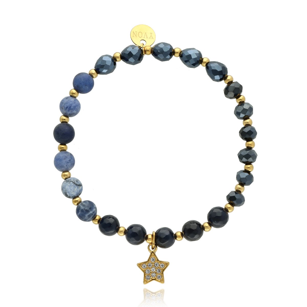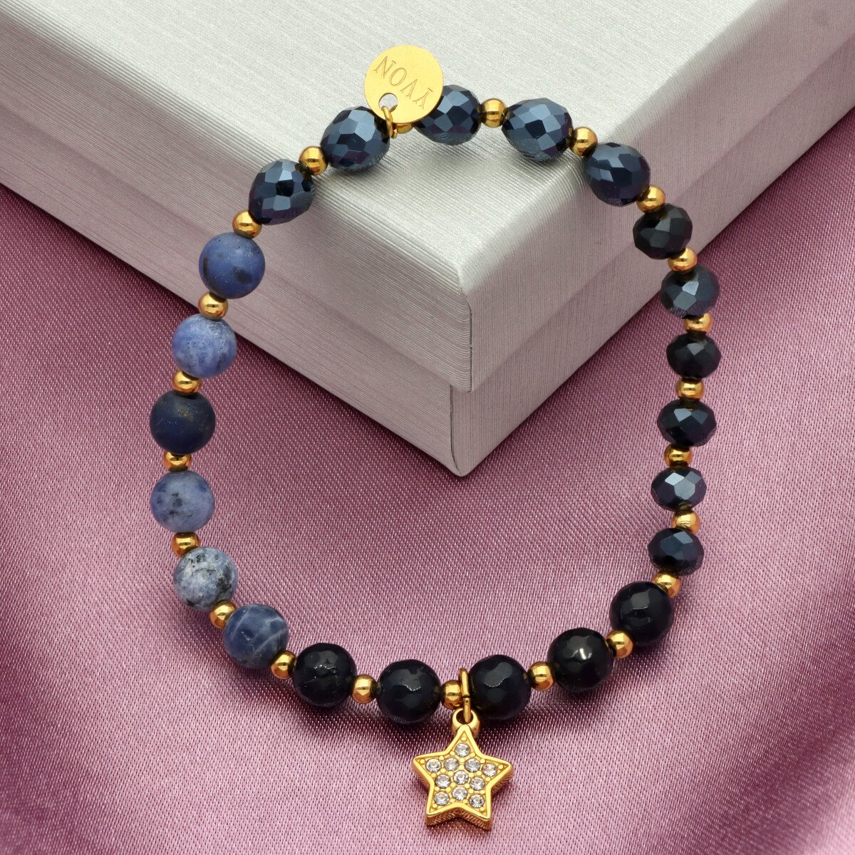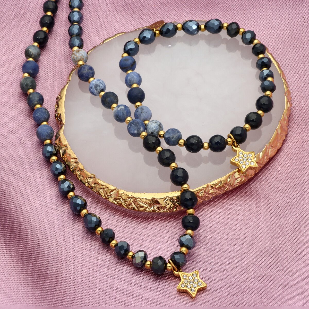 Delikatna bransoletka wykonana z agatu i kryształów, uzupełniona pozłacaną stalą szlachetną. Kamienie dodają całości głębi, a eleganckie złocenie subtelnie podkreśla kobiecy styl.