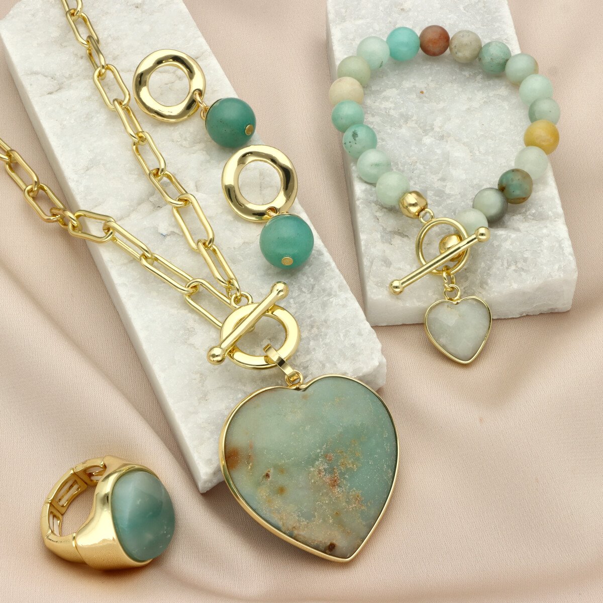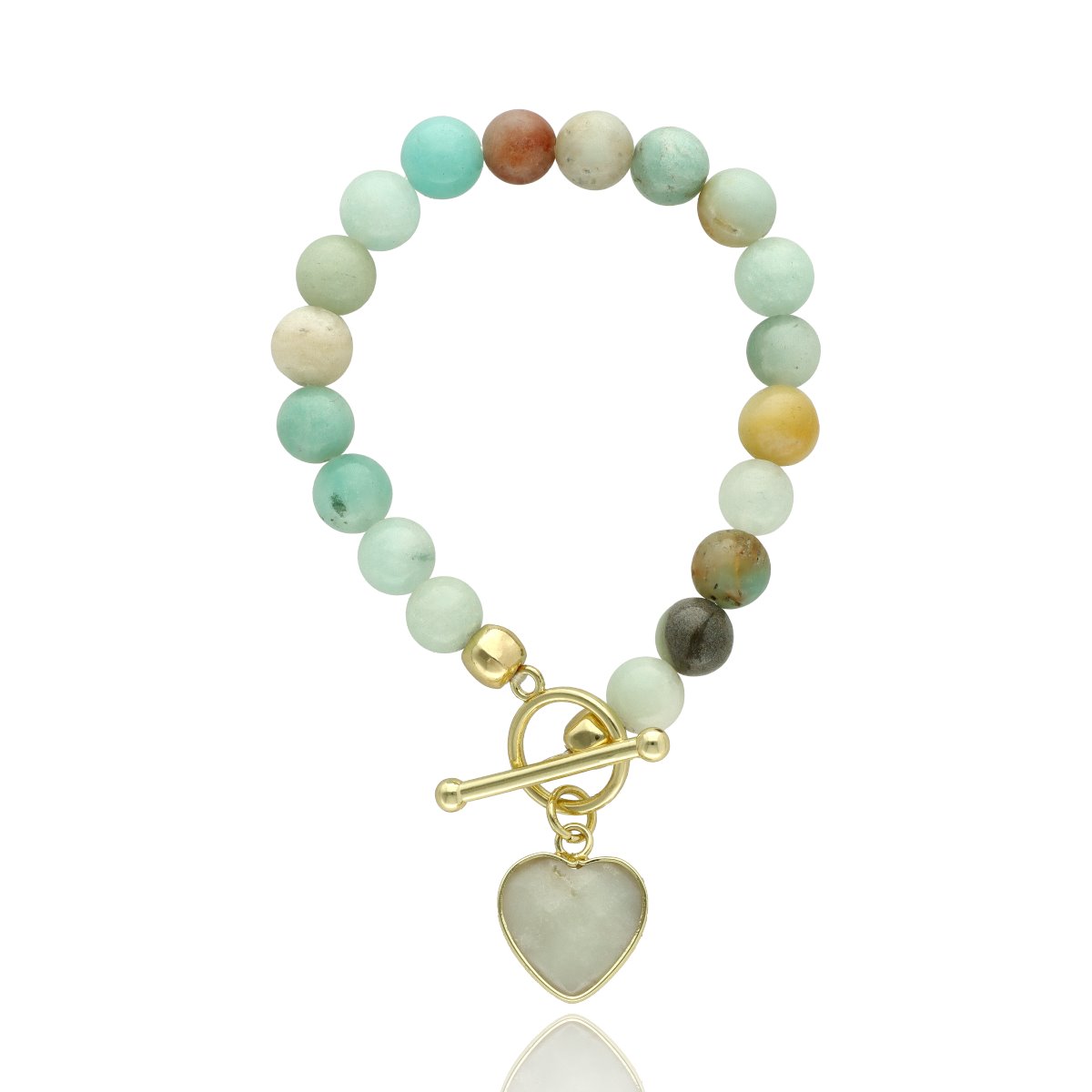 Stylowa bransoletka z naturalnym amazonitem to subtelne uzupełnienie naszyjnika. Kamienie o delikatnej, matowej strukturze i zróżnicowanych odcieniach zieleni oraz błękitu tworzą lekką, harmonijną kompozycję.