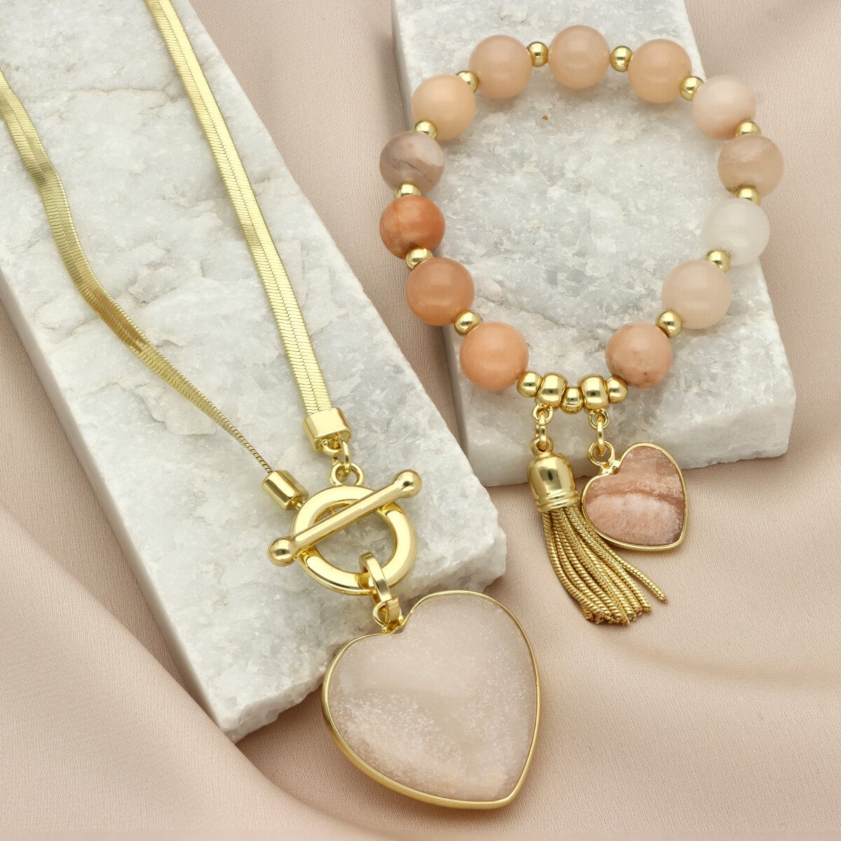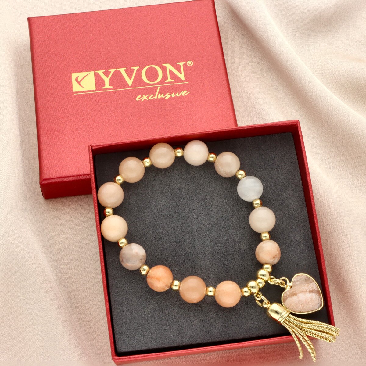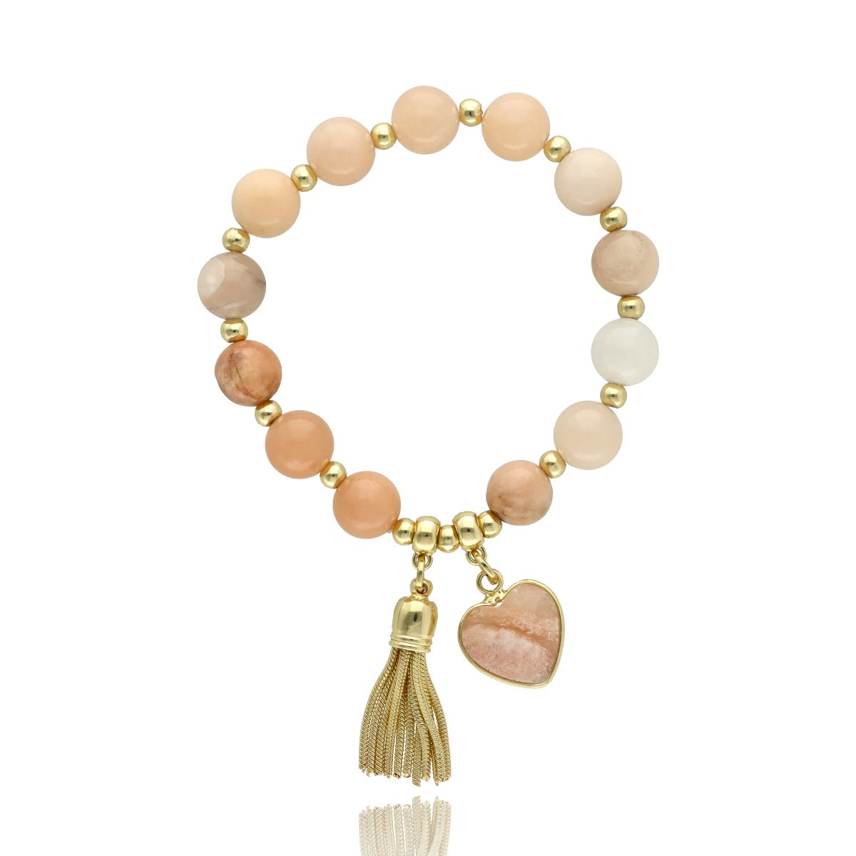 Stylowa bransoletka z naturalnym kamieniem awenturyn truskawkowy to eleganckie uzupełnienie zestawu. Gładko szlifowane kamienie w brzoskwiniowo-różowych odcieniach z delikatnymi, naturalnymi przejściami tworzą spójną i ponadczasową kompozycję.