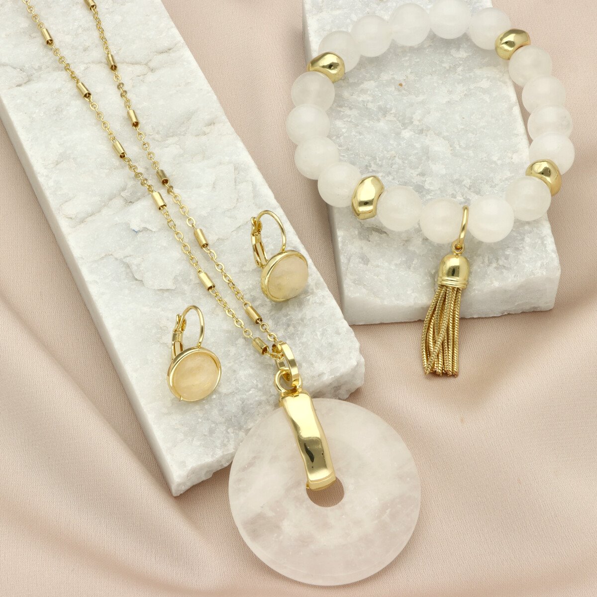 Stylowa bransoletka z naturalnym kamieniem jadeit mleczny to eleganckie uzupełnienie zestawu. Gładko szlifowane kamienie o mleczno-białym odcieniu z delikatnym, woskowym połyskiem tworzą spójną i ponadczasową kompozycję.
