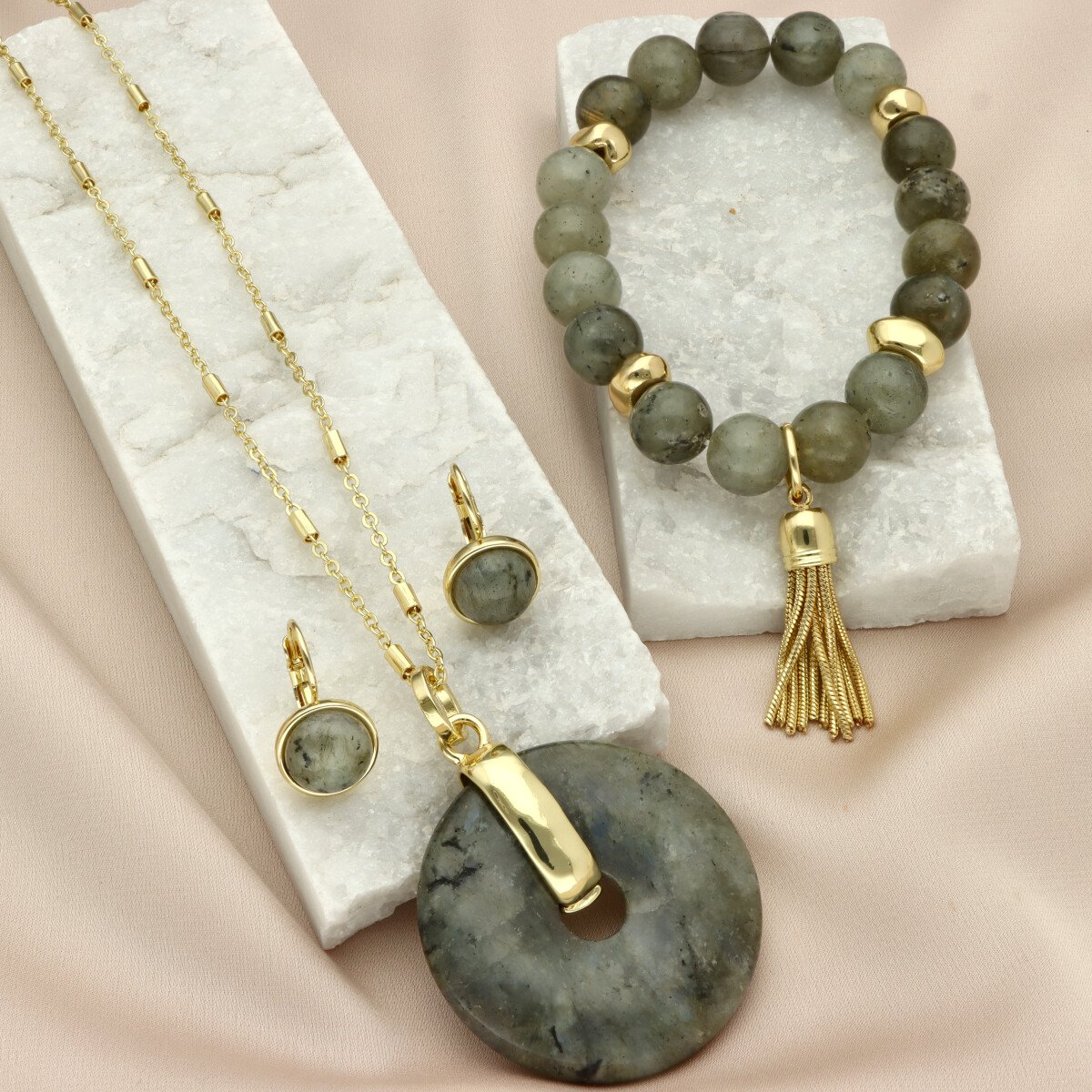 Stylowa bransoletka z naturalnym kamieniem labradoryt to eleganckie uzupełnienie zestawu. Gładko szlifowane kamienie o szaro-zielonym odcieniu z delikatnym efektem refleksów tworzą spójną i ponadczasową kompozycję.