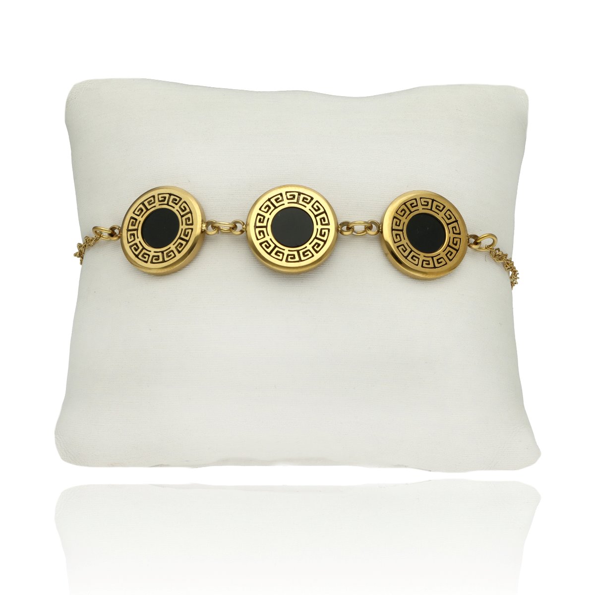 Bransoletka wykonana z wysokogatunkowej stali szlachetnej 316L, pozłacanej 16-karatowym złotem. Składa się z trzech połączonych elementów ozdobnych o średnicy 14 mm, spiętych delikatnym łańcuszkiem.