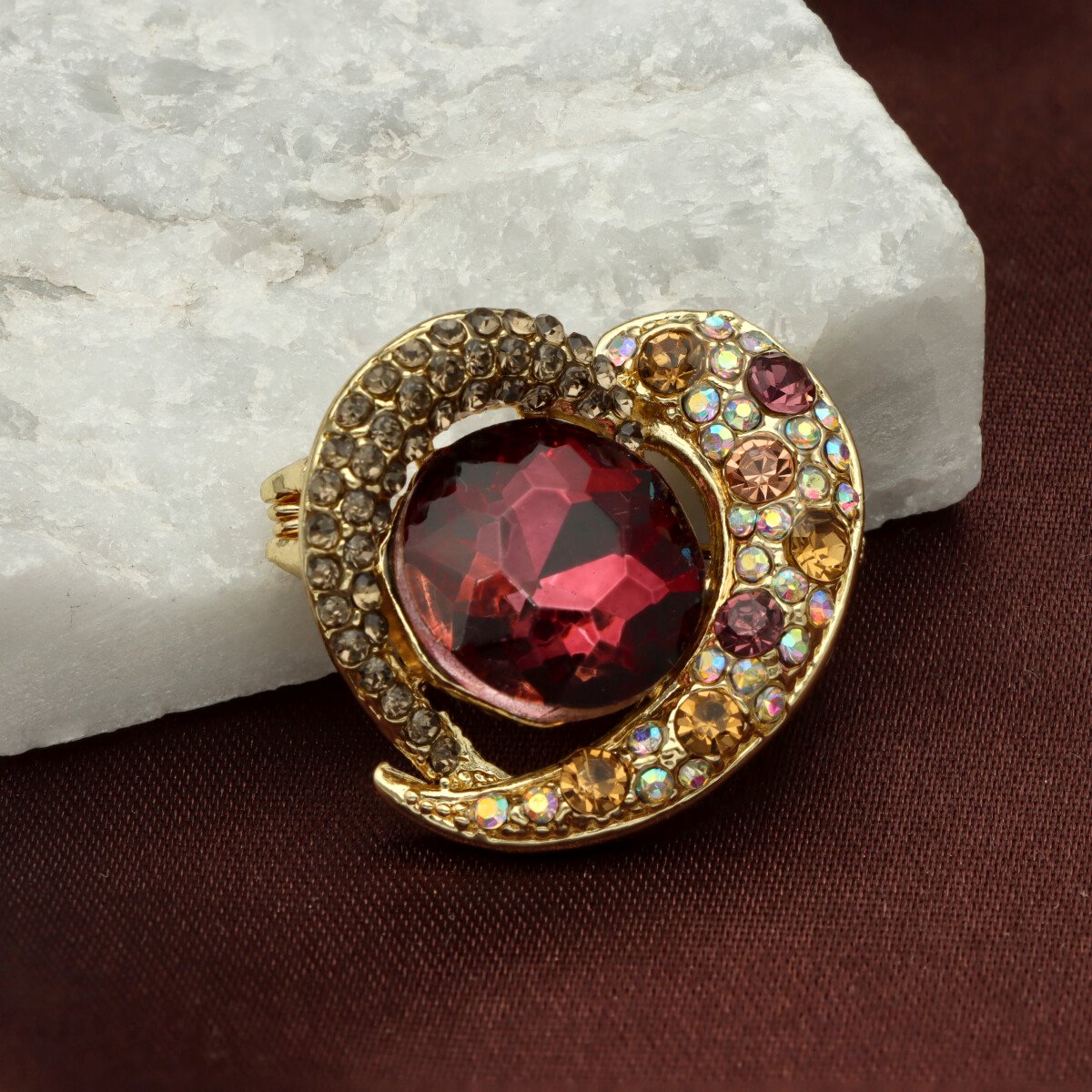 Elegancka broszka wykonana z wysokiej jakości szkła fasetowanego oraz metalu hypoalergicznego. Subtelny dodatek, który idealnie wpisuje się w jesienne stylizacje.