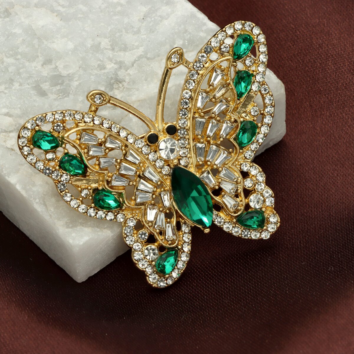 Elegancka broszka wykonana z wysokiej jakości szkła fasetowanego, cyrkonii oraz metalu hypoalergicznego. Subtelny dodatek, który idealnie wpisuje się w jesienne stylizacje.