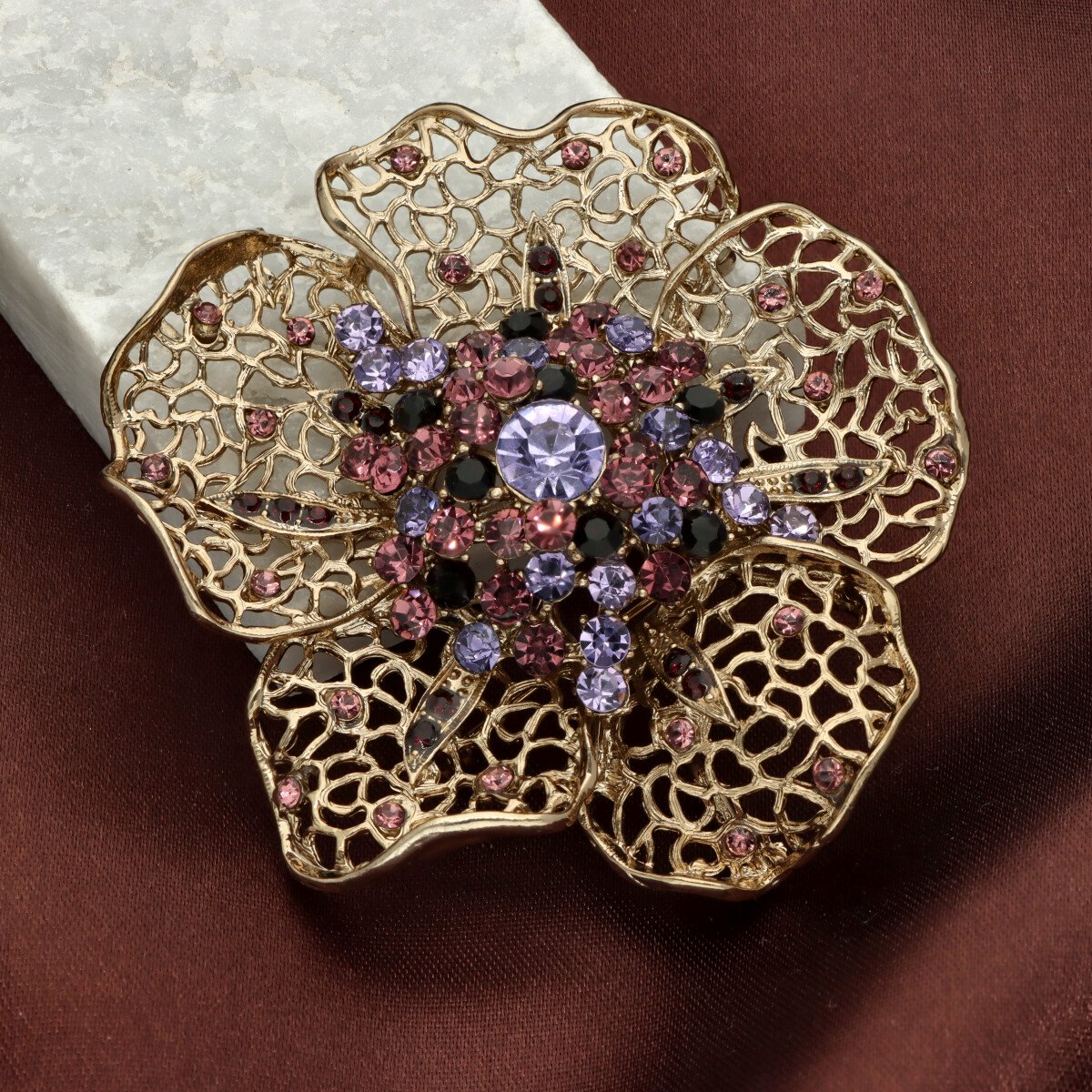 Elegancka broszka wykonana z wysokiej jakości szkła fasetowanego oraz metalu hypoalergicznego. Subtelny dodatek, który idealnie wpisuje się w jesienne stylizacje.